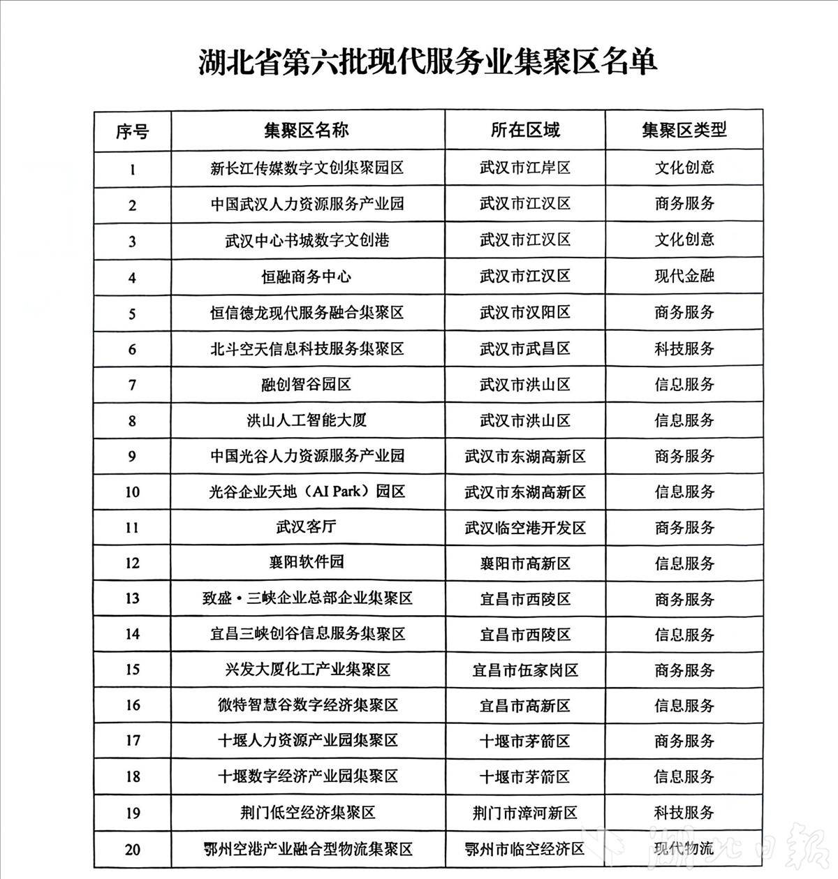湖北日报讯(记者谢慧敏、通讯员詹嘱)1月6日,省发改委印发通知,确定新长江传媒数字文创集聚园区、中国武汉人力资源服务产业园等20家产业集聚区为湖北省第六批现代服务业集聚区。至此,我省现代服务业集聚区已达140家。