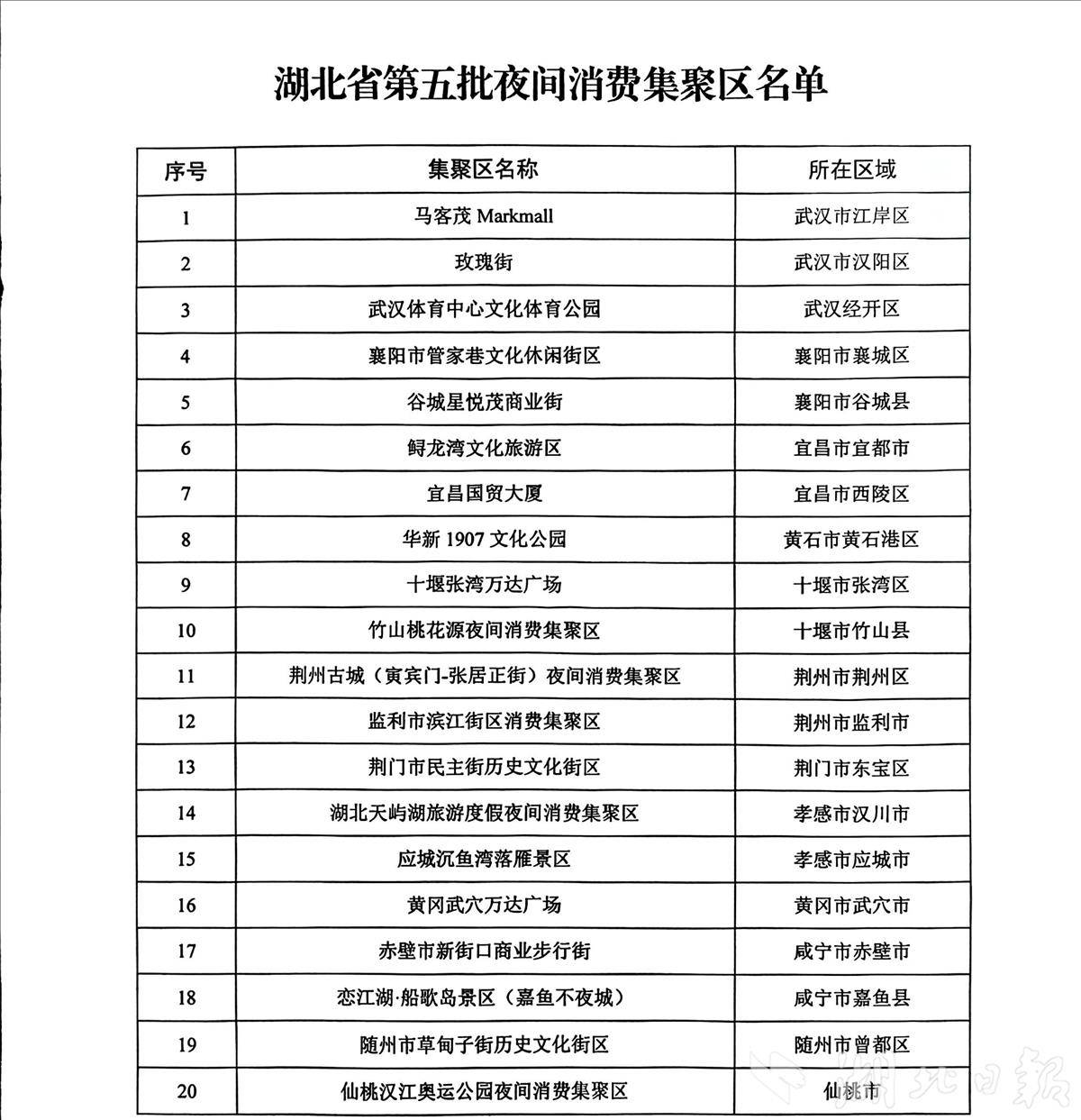 湖北日报讯(记者谢慧敏、通讯员詹嘱)1月6日,省发改委印发通知,确定马客茂Markmall、玫瑰街、武汉体育中心文化体育公园等20家特色集聚区为第五批省级夜间消费集聚区(以下简称“集聚区”)。