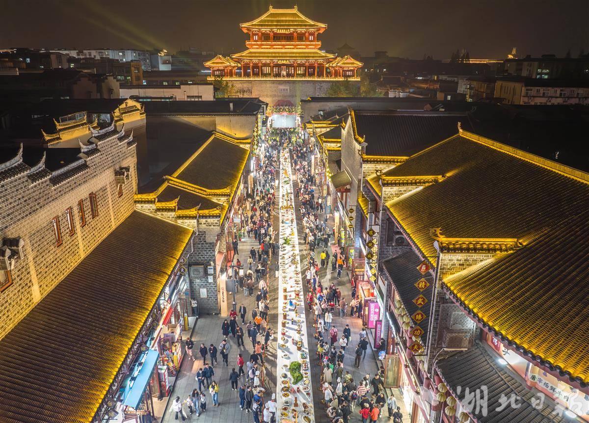 11月14日,市民和游客在襄阳古城北街游览古风市集、观看百米长桌宴。