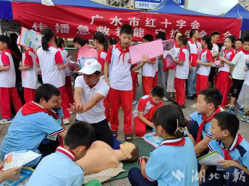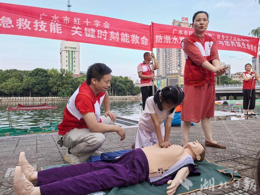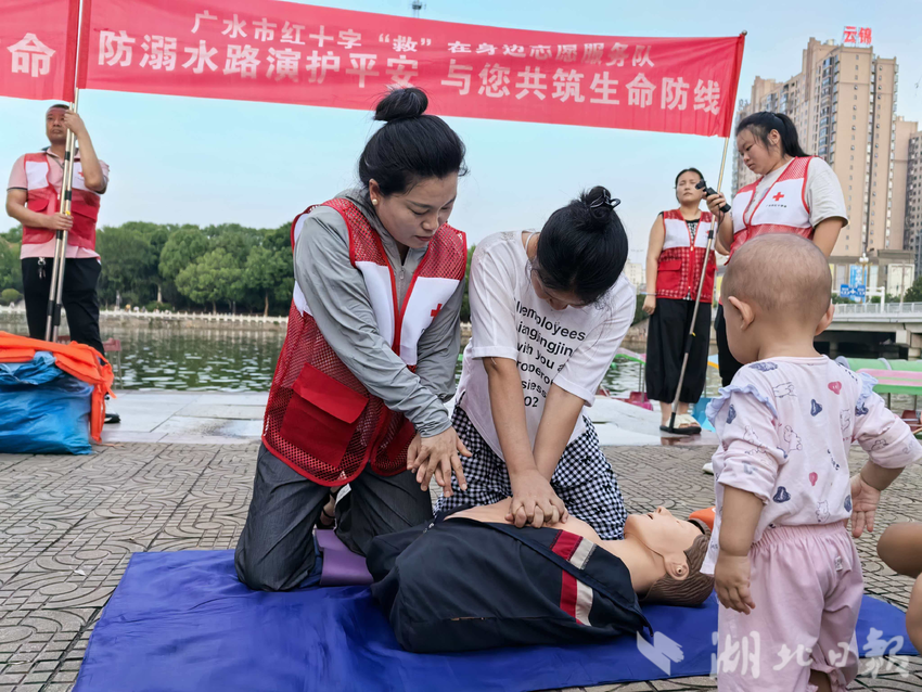 红马甲与党员徽章交相辉映,成为广水最温暖的城市底色。在全国汽车(房车)露营集结赛现场,红十字应急救护志愿服务队专业守护,为赛事筑牢生命安全屏障;在应山街道黑虎冲社区,防溺水急救路演生动开讲,20余名救护师和志愿者用真实案例敲响安全警钟,其科普经验在全省推广。