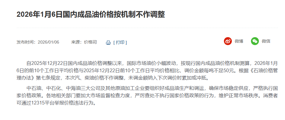 记者获悉,1月6日24时(今天晚上12点),2026年第一轮成品油调价窗口正式开启。据国家发展改革委价格监测中心监测,本轮成品油调价周期内(2025年12月22日—2026年1月5日),国际油价窄幅波动,按现行国内成品油价格机制测算,调价金额每吨不足50元,本次汽、柴油价格不作调整,未调金额纳入下次调价时累加或冲抵。