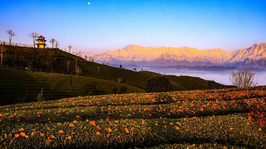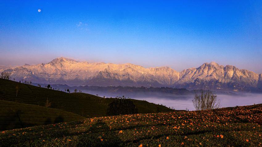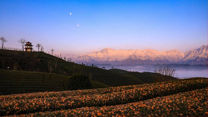 一轮晓日跃出天际,金红霞光泼洒开来,远处的雪山被染成绮丽的胭脂色。蓝天澄澈如洗,圆月与朝阳遥遥相望,清辉与金芒交融,云海腾浪,茶垄凝霜。一幅日月同辉、山海相映的奇景,在鹤峰走马的晨风中徐徐铺展,惊艳了山水,更惊艳了追光人的目光。