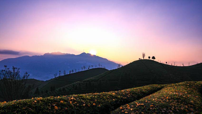 夜色尚未褪尽,圆月仍悬于天幕,清辉洒遍连绵茶园。须臾间,东方泛起鱼肚白,云海翻涌如白絮,将万亩茶垄轻轻托起。