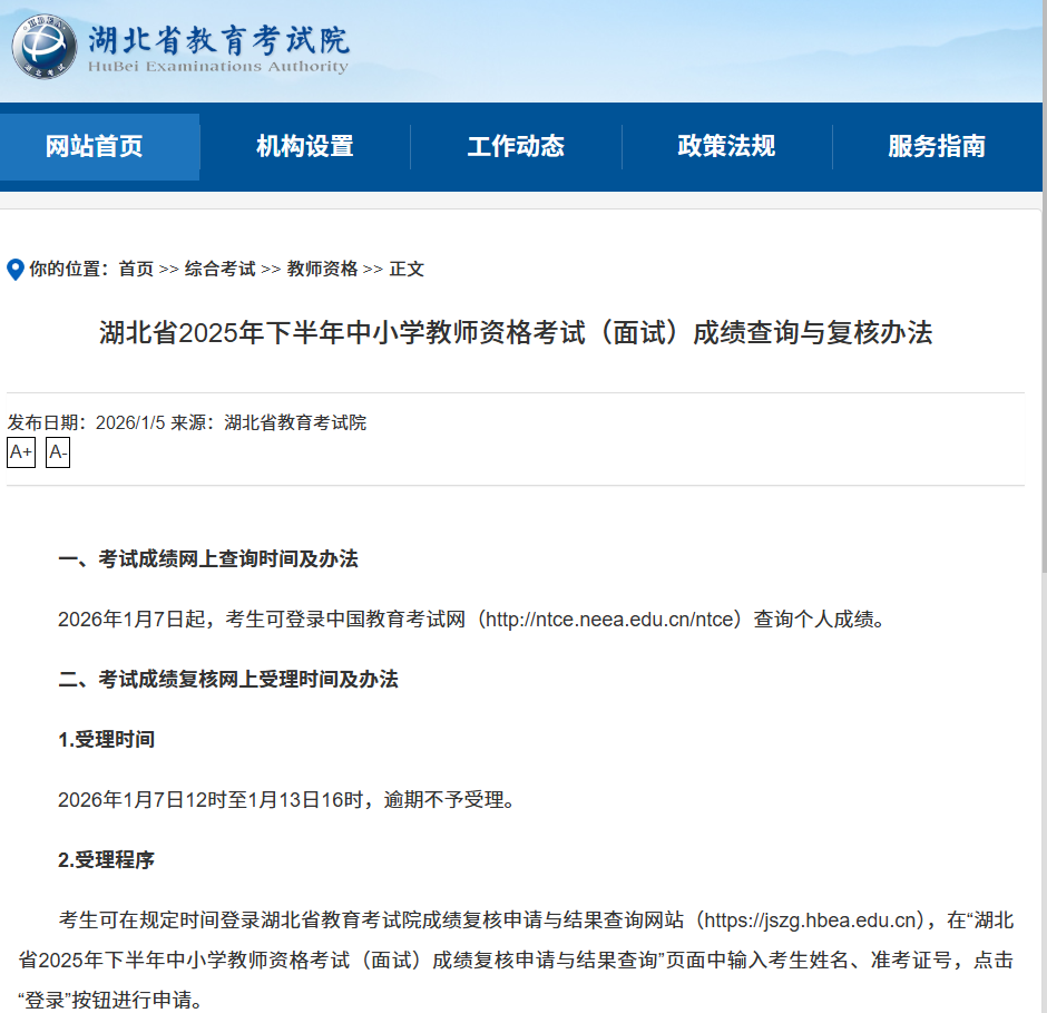 湖北日报讯(记者包东喜、通讯员沈考)1月7日,记者从湖北省教育考试院获悉,湖北省2025年下半年中小学教师资格考试(面试)成绩查询与复核办法公布,考生可在1月7日12时至1月13日16时进行考试成绩结果查询与复核申请。具体详情如下:
