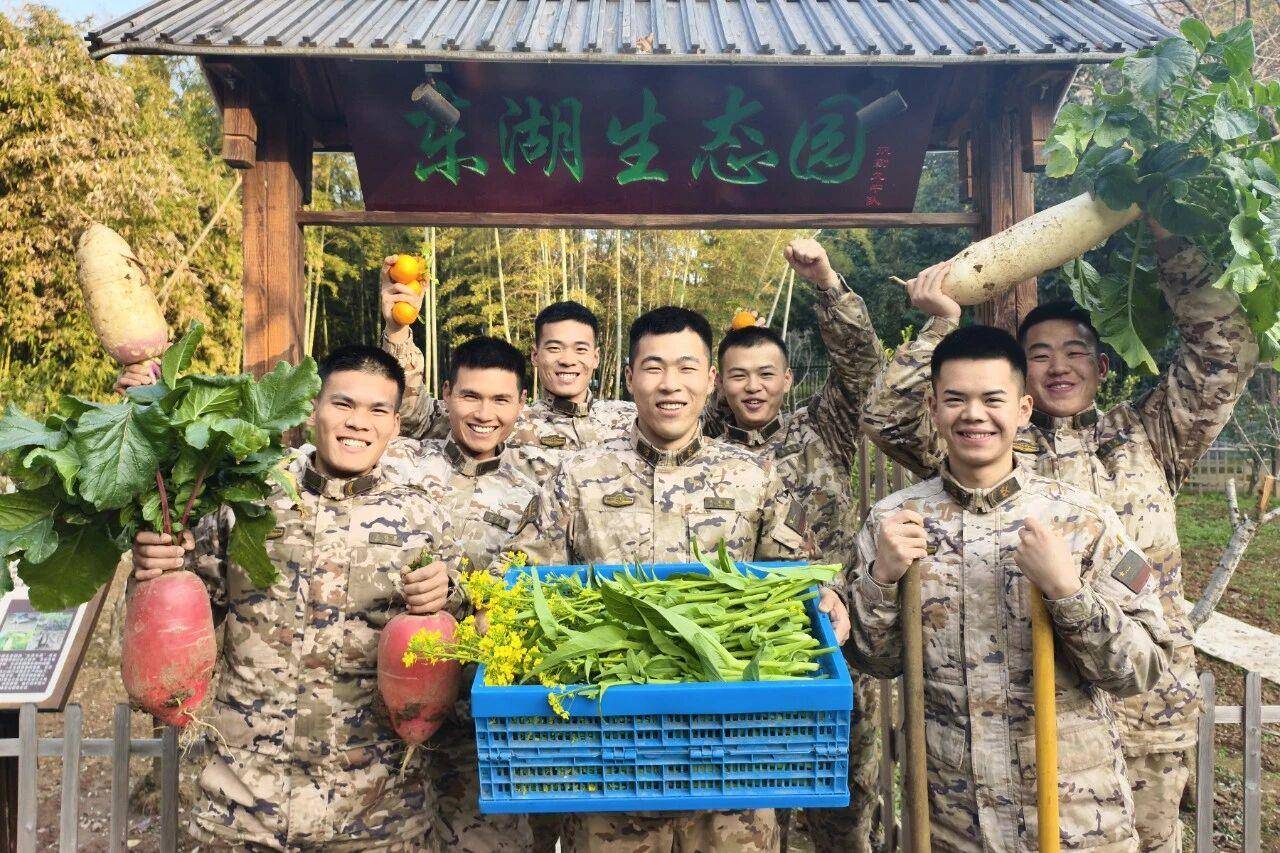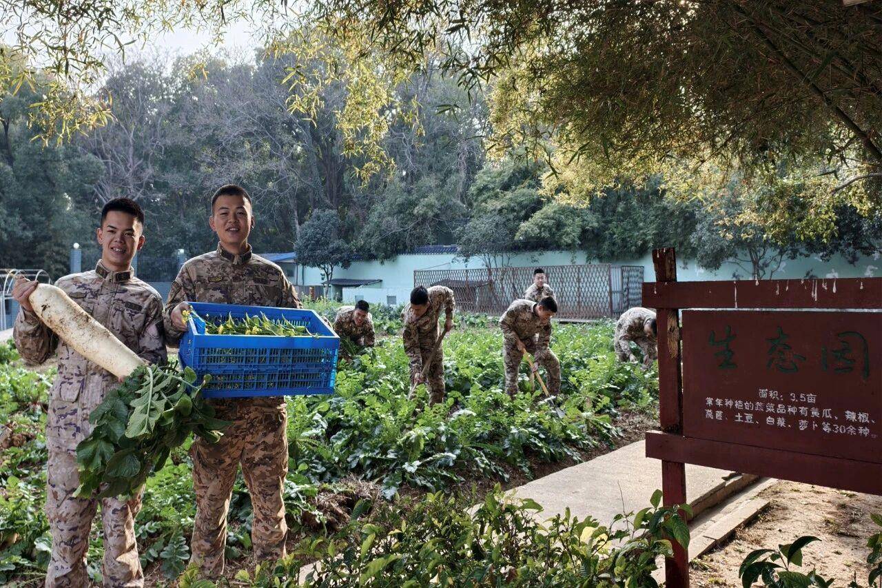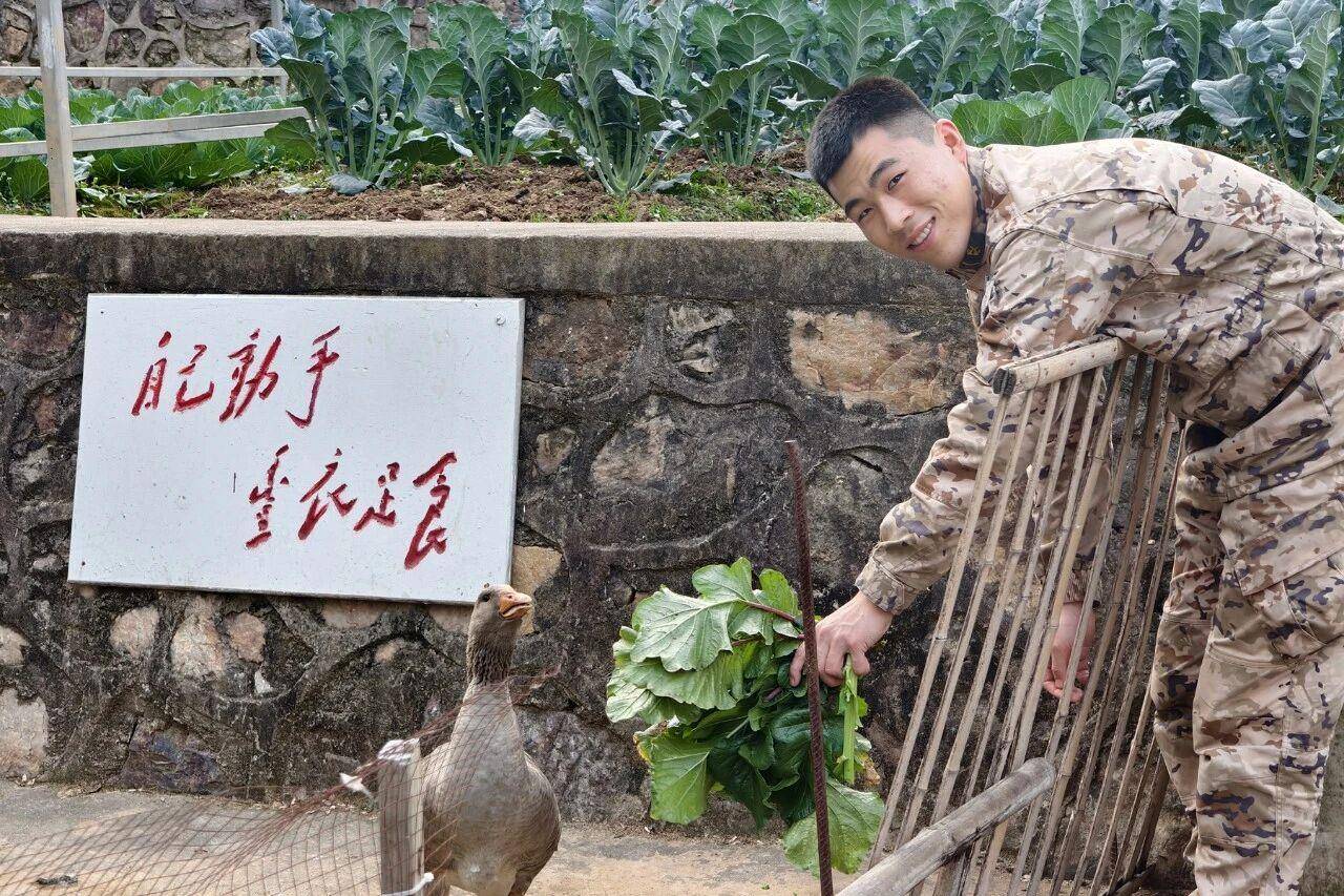 营区内,闲置空地被大家拾掇一新。训练之余,大家扛锄头、撒菜种、搭瓜架……到了丰收时节,青菜、辣椒堆满食堂菜篮,自养的家禽也成了餐桌上的“硬菜”。菜地管理员吴承栋说:“吃着自己种的菜,香!”