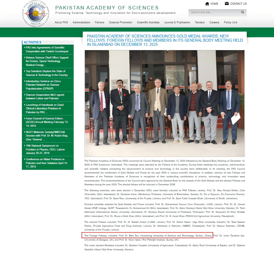 巴基斯坦科学院成立于1953年,是巴基斯坦最高学术机构,核心职能为促进该国科学、技术与创新以推动社会经济发展,并为政府在科技发展、科学教育等领域提供专业咨询,其院士称号是巴基斯坦科学界的最高荣誉。该机构院士遴选规则严格:候选人须作出原创性重大科学贡献,经提名、多轮评审后由院士大会选举产生;本国院士总数上限为100人(年增选不超过5人),外籍院士总数上限为30人(年增选不超过3人),目前全球仅35位学者获此称号。巴基斯坦科学院外籍院士阵容汇聚多位世界顶尖科学家,包括诺贝尔奖获得者、华裔物理学家丁肇中,中国科学院原院长、化学家白春礼等。本次遴选中共有3位学者当选外籍院士,除谭必恩外,还包括英国格拉斯哥大学的乌默尔·吉山·伊贾兹教授、英国皮尔布赖特研究所的穆尼尔·伊克巴尔教授。