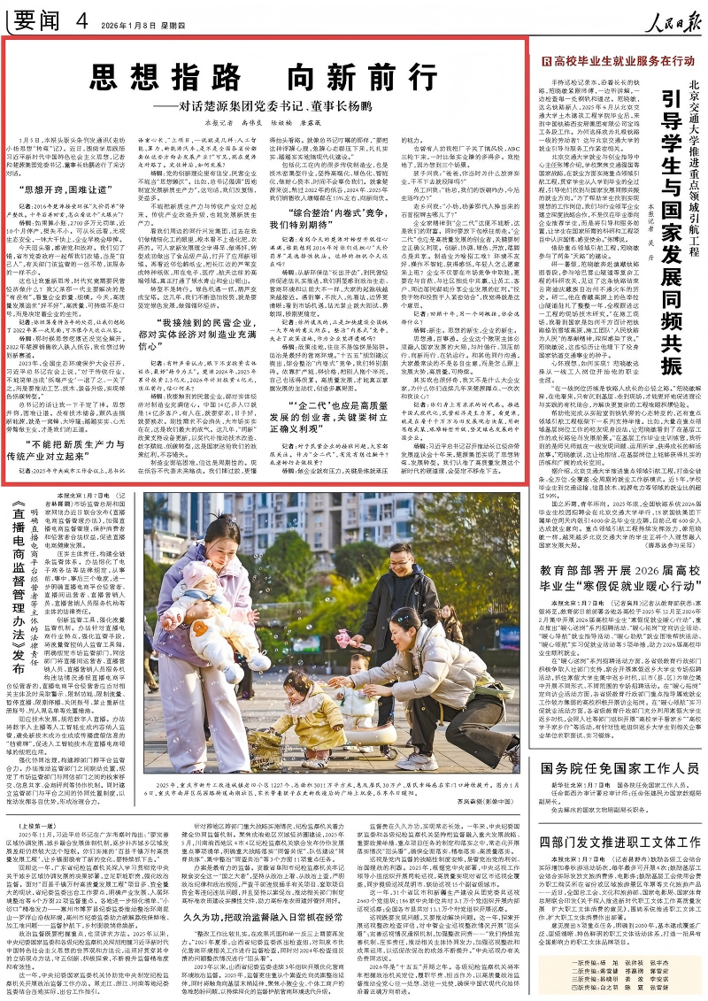 今天,《人民日报》再访楚源集团党委书记、董事长杨鹏。采访中,杨鹏讲述在经历经营低谷后,通过学思践悟习近平新时代中国特色社会主义思想,坚定推动传统企业高端化、绿色化、智能化升级,彰显民营企业以思想破冰引领发展突围的实践路径。