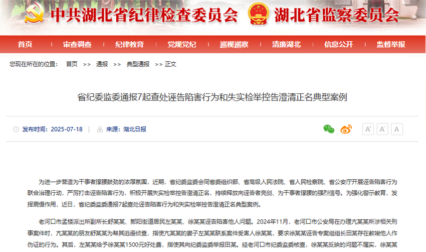 2025年7月18日,省纪委监委面向全省干部群众公开通报7起查处诬告陷害行为和失实检举控告澄清正名典型案例,释放出为担当者担当、为负责者负责的强烈信号,引起强烈反响。(来源:对省纪委监委网站案例通报的截图)