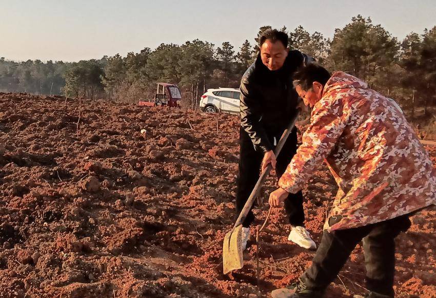 随县安居镇某村党支部书记、村委会主任刘某某经澄清正名后,进一步激发了干事创业激情,带领村民深耕黄桃特色产业,积极筹集资金硬化通村公路,解决群众出行难题。图为刘某某正在帮群众栽种黄桃树幼苗。(随县纪委监委供图)