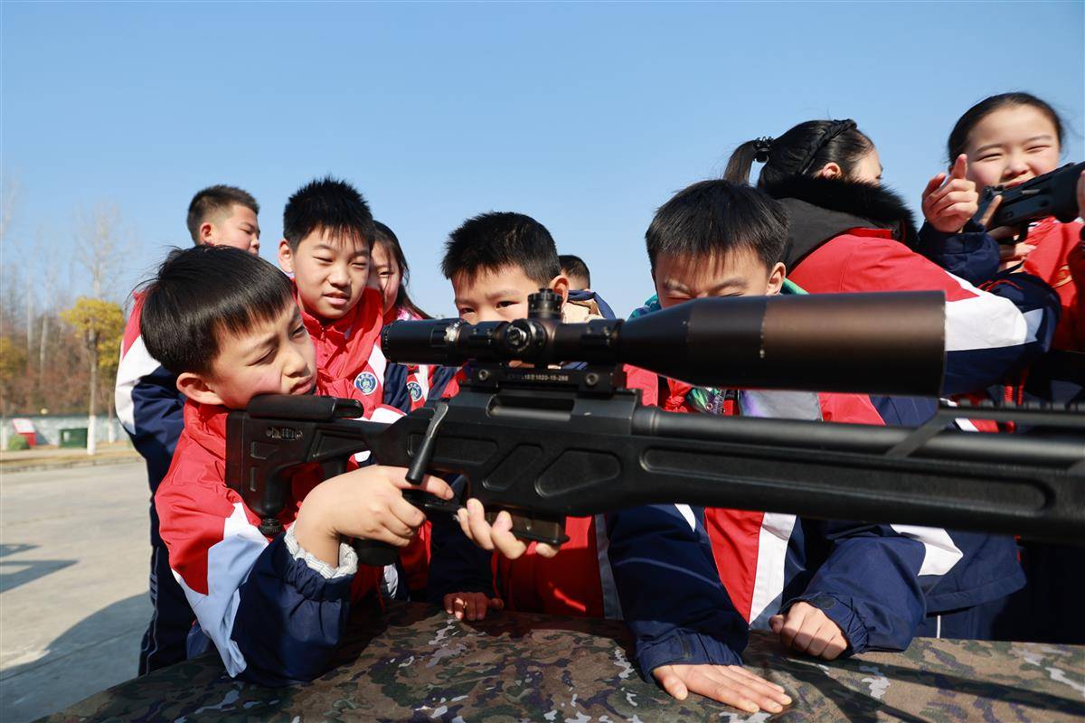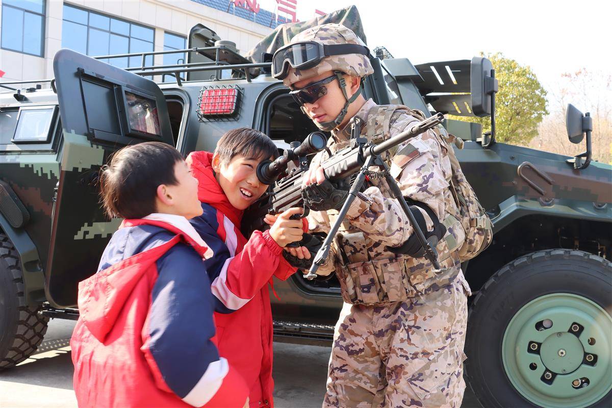 在武器装备展示区,官兵细致讲解各类枪械的性能特点,学生们围拢在展示台旁,小心翼翼地触摸枪身、抬起钢枪,“狙击枪比想象中重太多”“瞄准镜看得太清楚了”……孩子们的惊叹声不绝于耳。