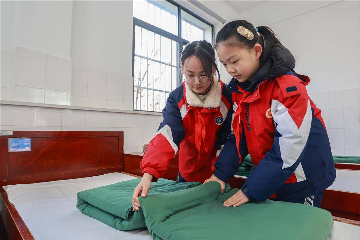 孩子们走进班排宿舍,洁白的床单与棱角分明的“豆腐块”被子,让学生们踊跃拜师学艺。在官兵的耐心指导下,孩子们认真学习叠军被。