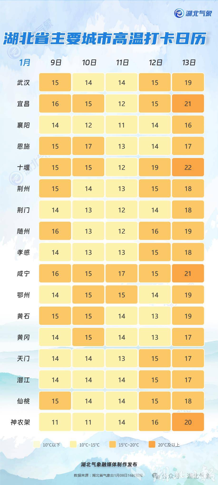 将冲上20℃,湖北或将迎来最暖“三九”,最低气温也将小幅上涨,除鄂西北外大部地区将升至0℃以上,气温将波动回升。