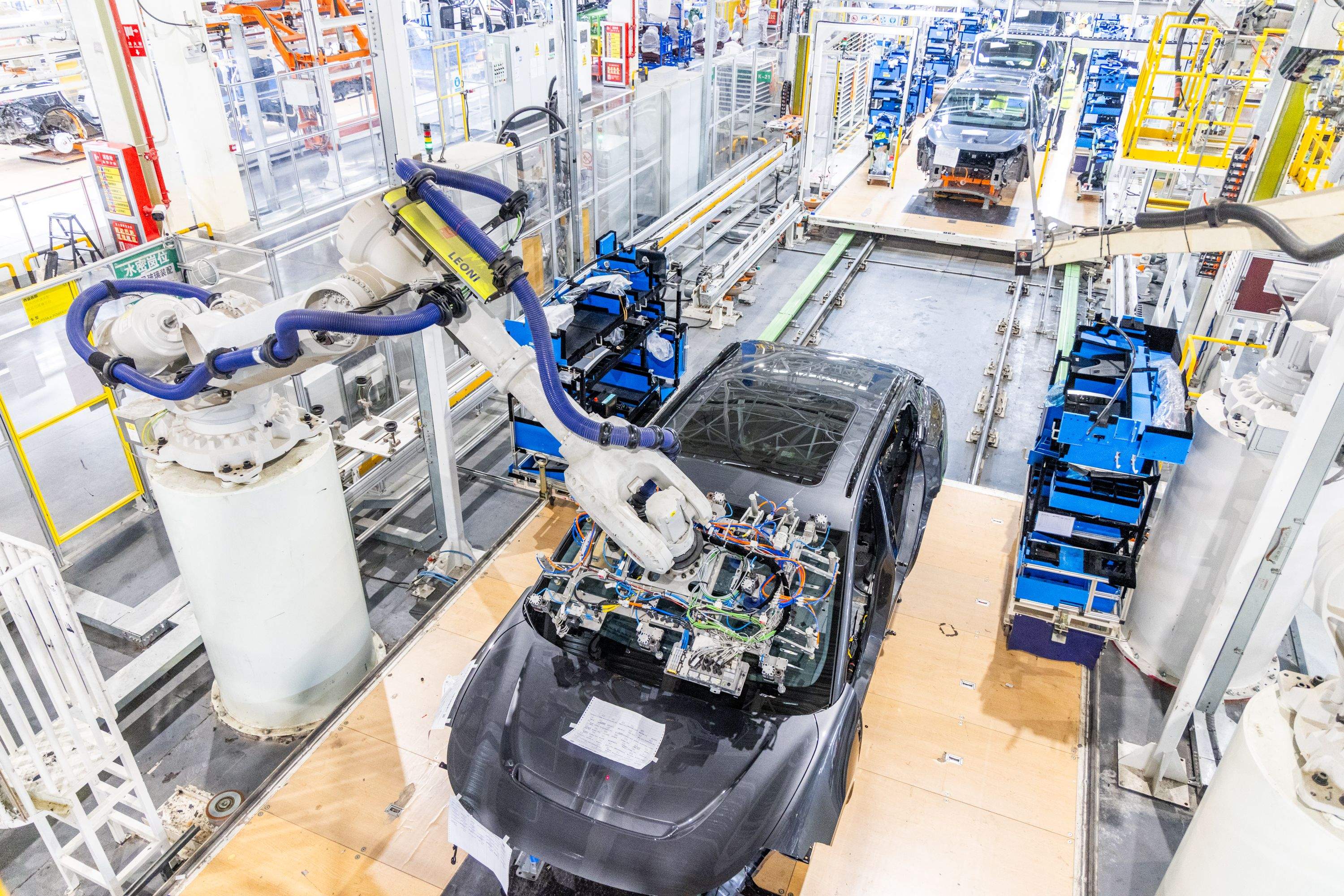岚图汽车生产线上,机器人正在进行全新岚图知音挡风玻璃涂胶安装作业。通讯员李岿 摄