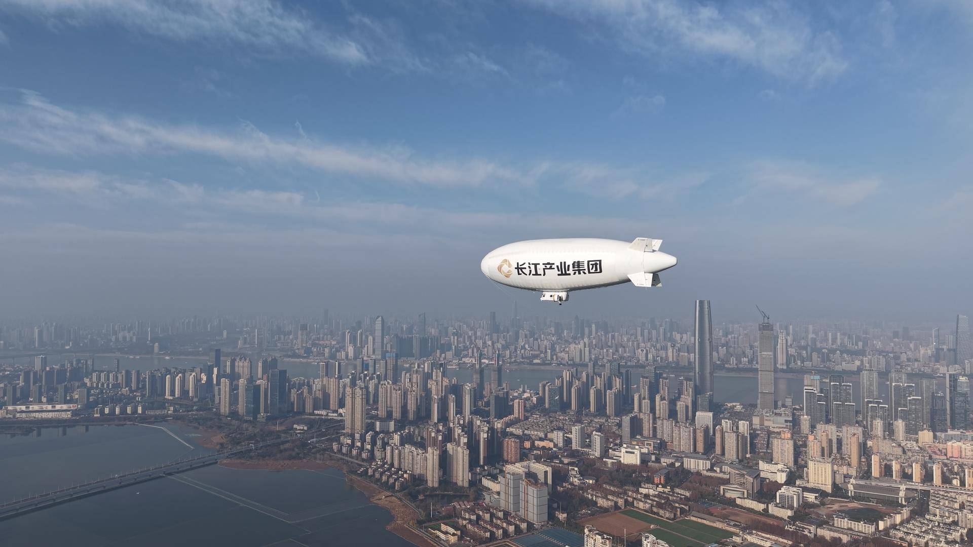 “祥云”AS700载人飞艇飞跃城市上空