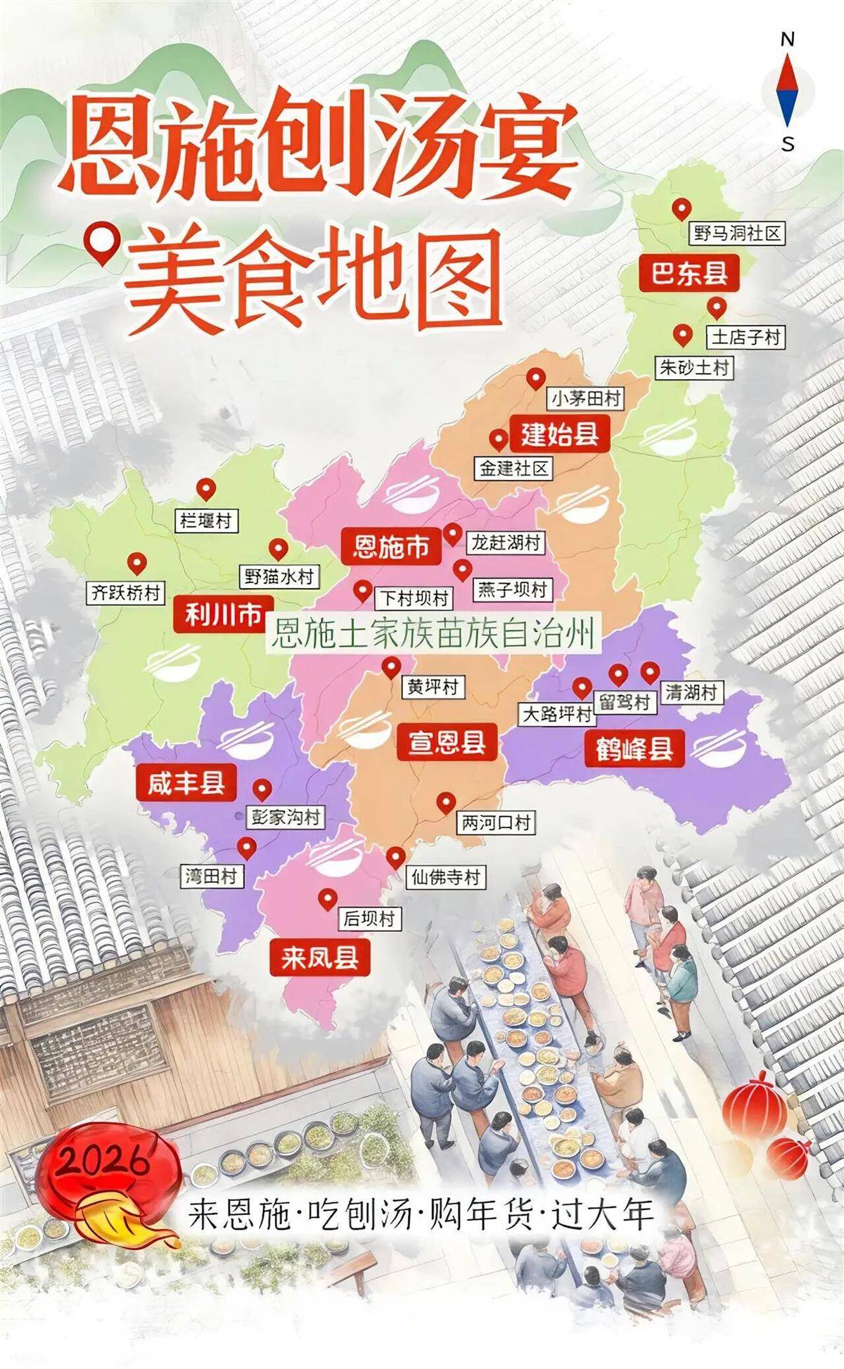 湖北日报讯(记者鲁腾、通讯员朱映诚、蒋姮)1月10日,恩施州8县市20个特色乡村同步拉开“来恩施·吃刨汤·购年货·过大年”民俗美食促消费活动帷幕,这场贯穿农历冬月廿二至腊月二十四(1月10日至2月11日)的民俗盛宴,以土家特色刨汤文化为纽带,串联美食体验、年货采购、非遗展演等多元业态,让土家年俗文化成为吸引游客的核心亮点。