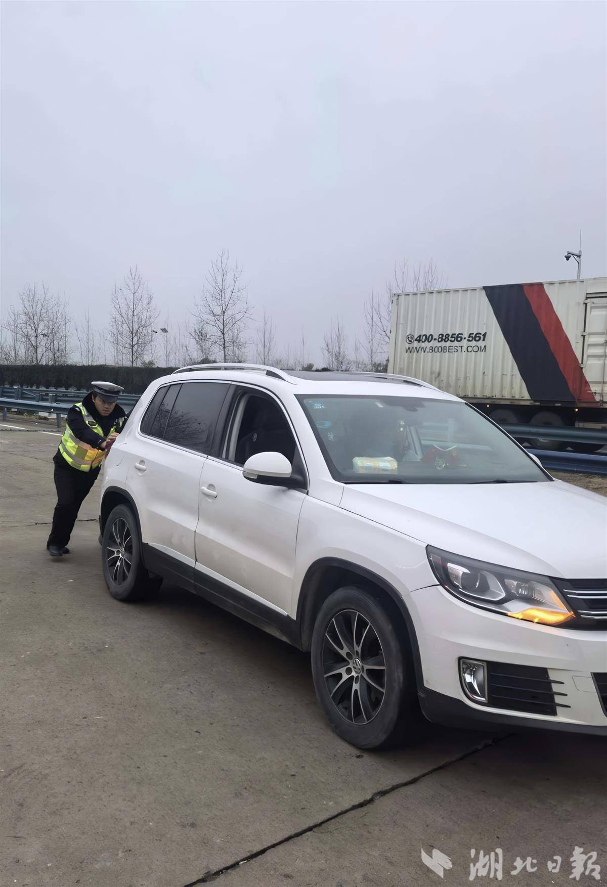 高速交警江岸大队队员停车区帮助故障车辆脱困