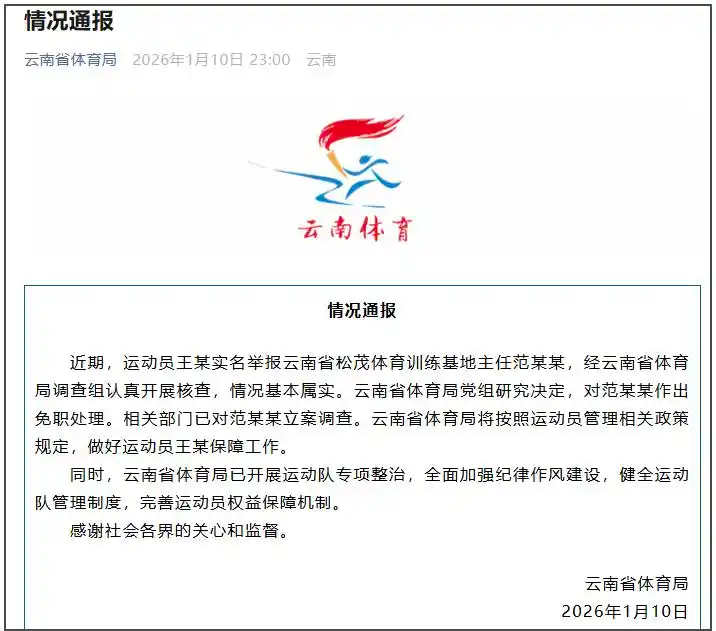 免职不是终点。据媒体报道,2026年1月9日晚,也就是云南省体育局发布通报的前一天,王某再次公开发声,称自己于12月25日又递交了新的举报材料,包括范某某大搞封建迷信活动、猥亵女队员、家属吃空饷等材料。这些问题到底属不属实,公众也期待有清晰的调查结果。从目前的官方通报来看,暂未涉及这些问题的说明。通报中“相关部门已对范某某立案调查”的表述,也让公众对该事件持续保持关注。