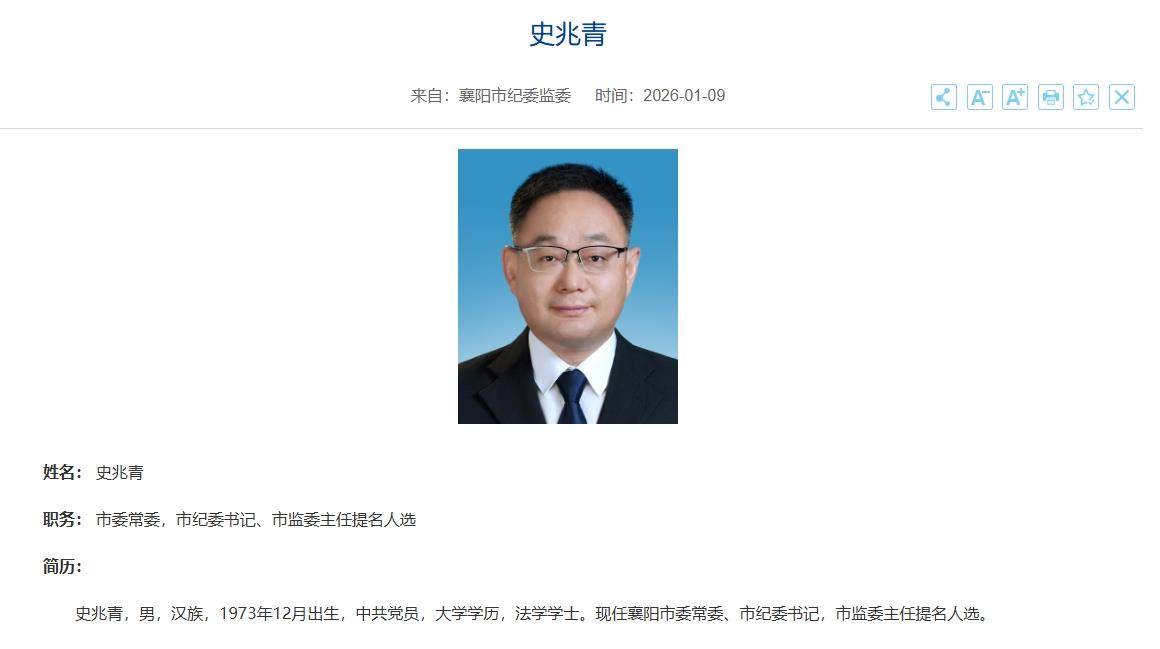 1月11日,襄阳市纪委监委网站显示,史兆青已任襄阳市委常委、市纪委书记,市监委主任提名人选。此前,史兆青任武汉市纪委副书记、市监委副主任,二级高级监察官。