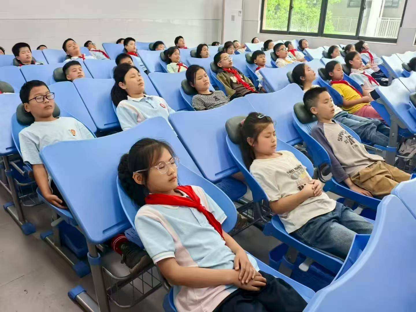 武穴市东方红小学学生在躺椅上午休。