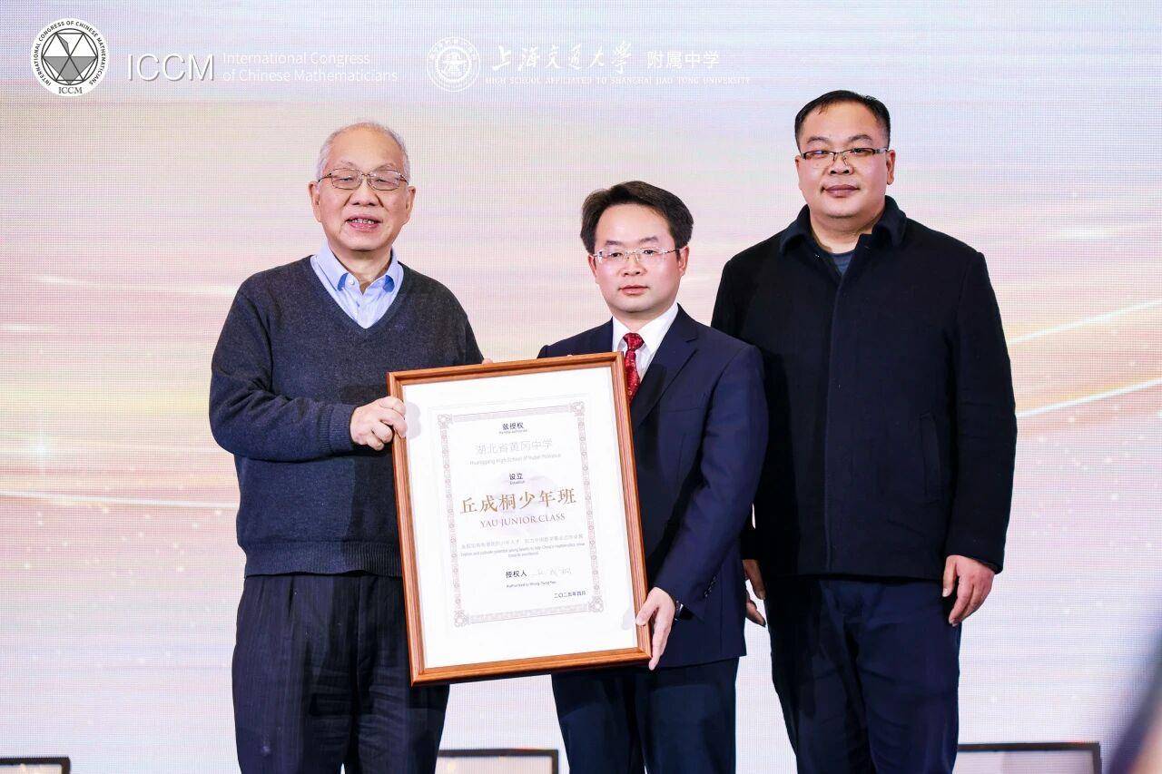 丘成桐院士(左)为黄冈中学授牌。