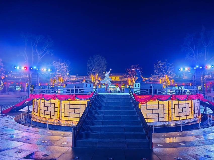 漫步景区,音乐喷泉随着旋律起舞,在灯光映照下宛如梦幻仙境,游客们驻足观赏,不时发出阵阵赞叹。皮影艺术馆内,传统皮影戏正精彩上演,艺人巧手操纵,光影交错间,一个个生动形象跃然幕上,引得观众掌声连连。花船在湖面轻轻游曳,船身装饰精美,与周围灯光相映成趣,为静谧的夜晚增添了几分灵动与诗意。