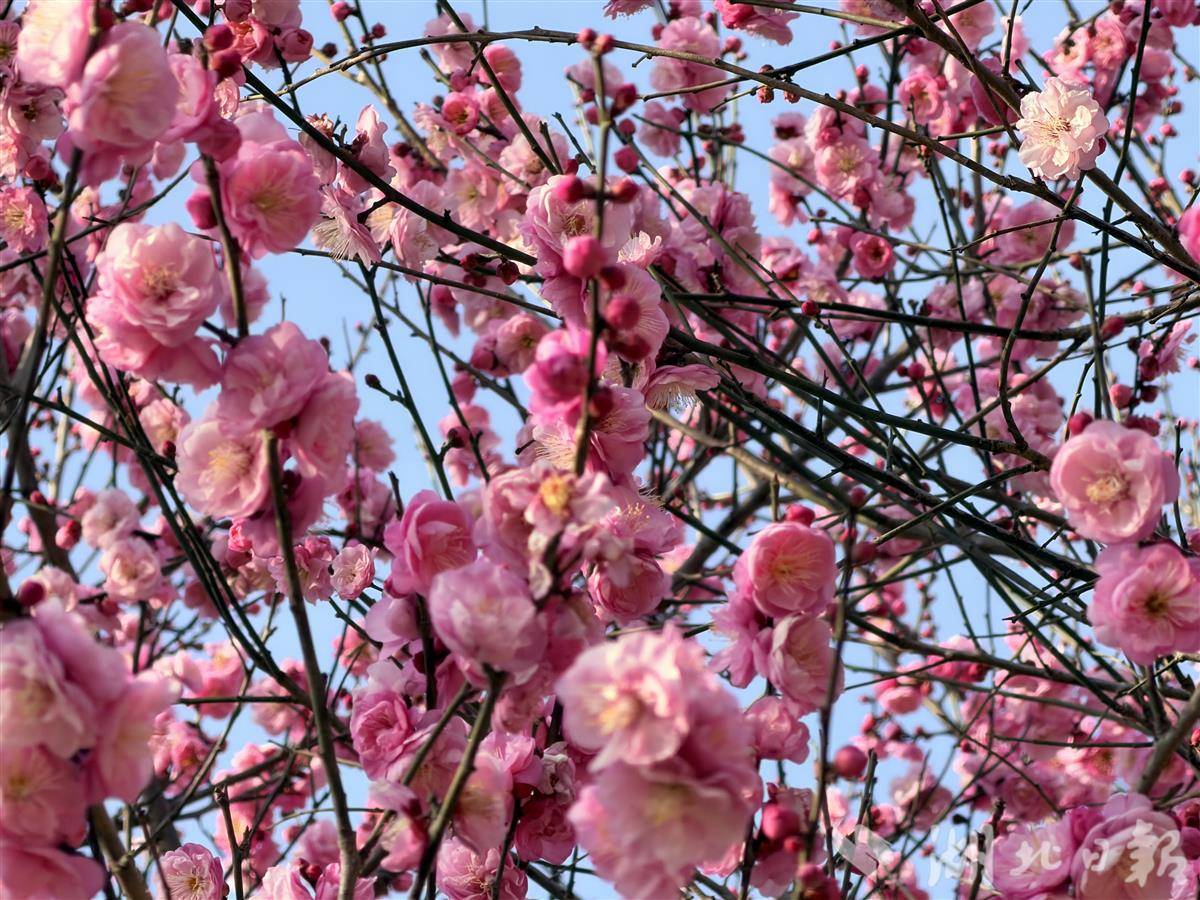 记者踏上缓坡,越往坡顶走,人气越旺,花香愈浓,蜜蜂翻飞于花枝之间。这片占地约8000平方米的坡地上,栽植着红梅、宫粉梅、绿萼梅、白梅等四个品种共500余株梅树。坡顶北侧光照充足,上百株红梅与宫粉梅已竞相开放,汇成一片绚烂的“粉色云霞”,与南侧尚在蓄蕾、点点白梅吐蕊的静谧景象相映成趣。
