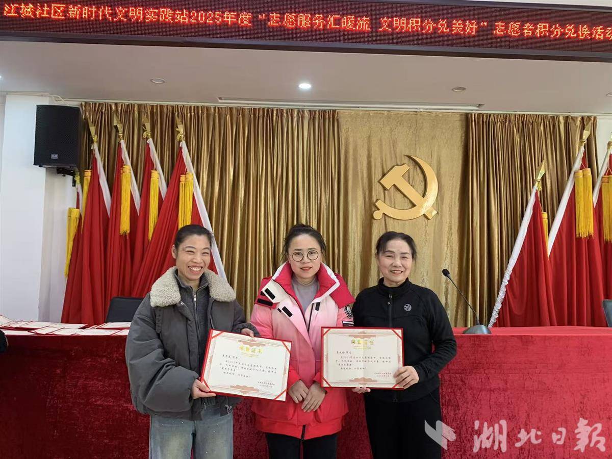 湖北日报讯(通讯员浩轩)为进一步激发居民参与社区治理的内生动力,深化“小巷微自治”治理模式,1月9日下午,荆州市江陵县郝穴镇社会工作服务站联合江城社区,举办了“志愿服务汇暖流 文明积分兑美好”年度志愿者积分集中兑换暨表彰活动。本次活动通过看得见、摸得着的回馈形式,礼遇志愿者,传递社区温度,营造“人人参与、人人共享”的和谐氛围。