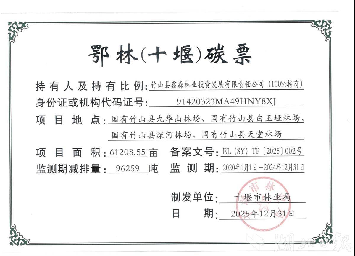 第一张“绿色名片”是鄂林碳票。2025年12月31日,湖北省竹山县林业局完成国有九华山林场、白玉垭林场、深河林场、天堂林场四大林场鄂林碳票(第一期)的计量核算与审定核查,这是该县首张鄂林碳票。