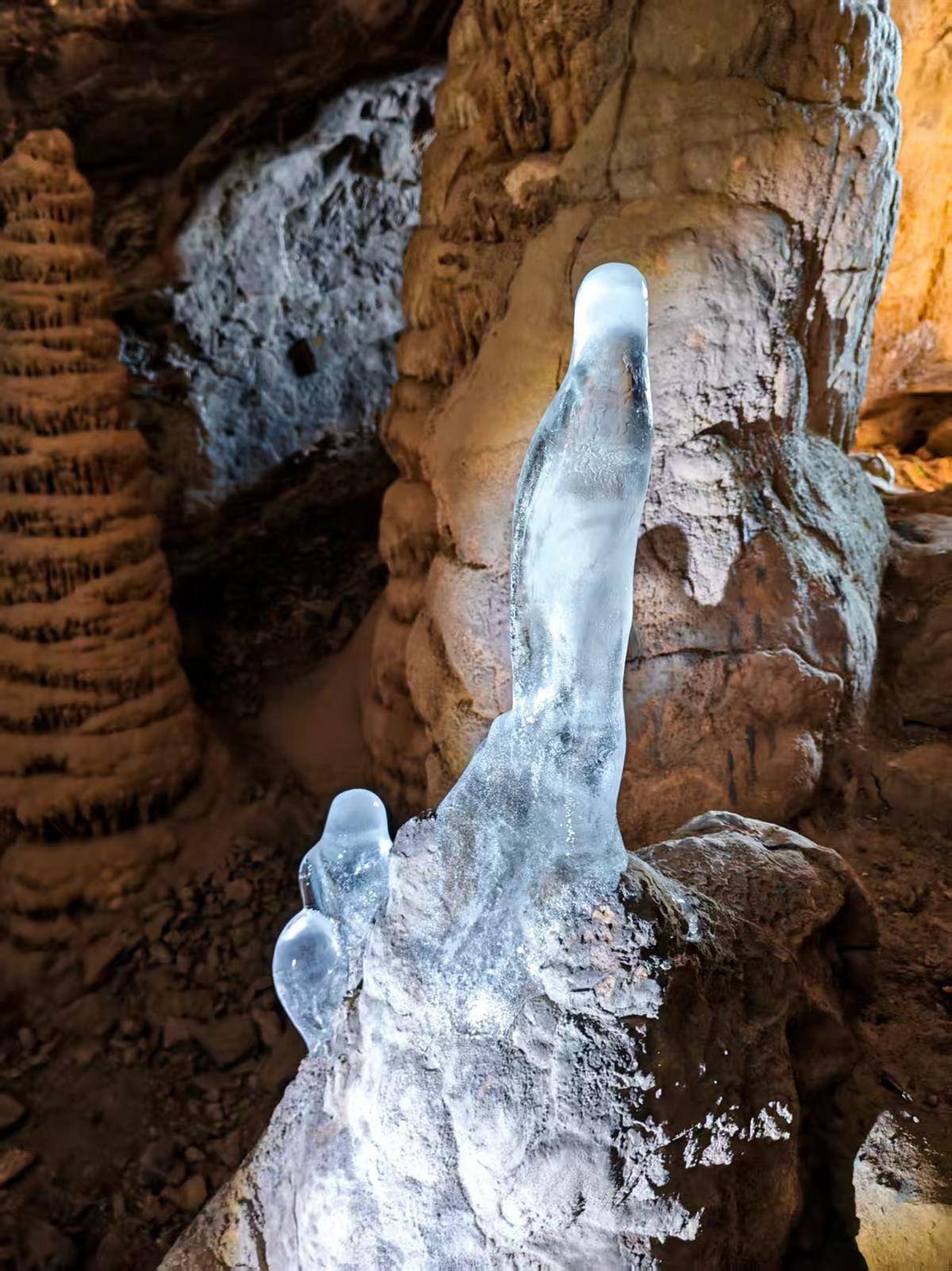 走进山洞,只见洞口长着几根晶莹剔透的冰柱。与其他地方冰柱不同,这些冰柱很圆润,像玉石一样从土里冒出来。“洞口气温低,有风,水从上面滴下来,慢慢凝结成了冰柱。”钟林说。