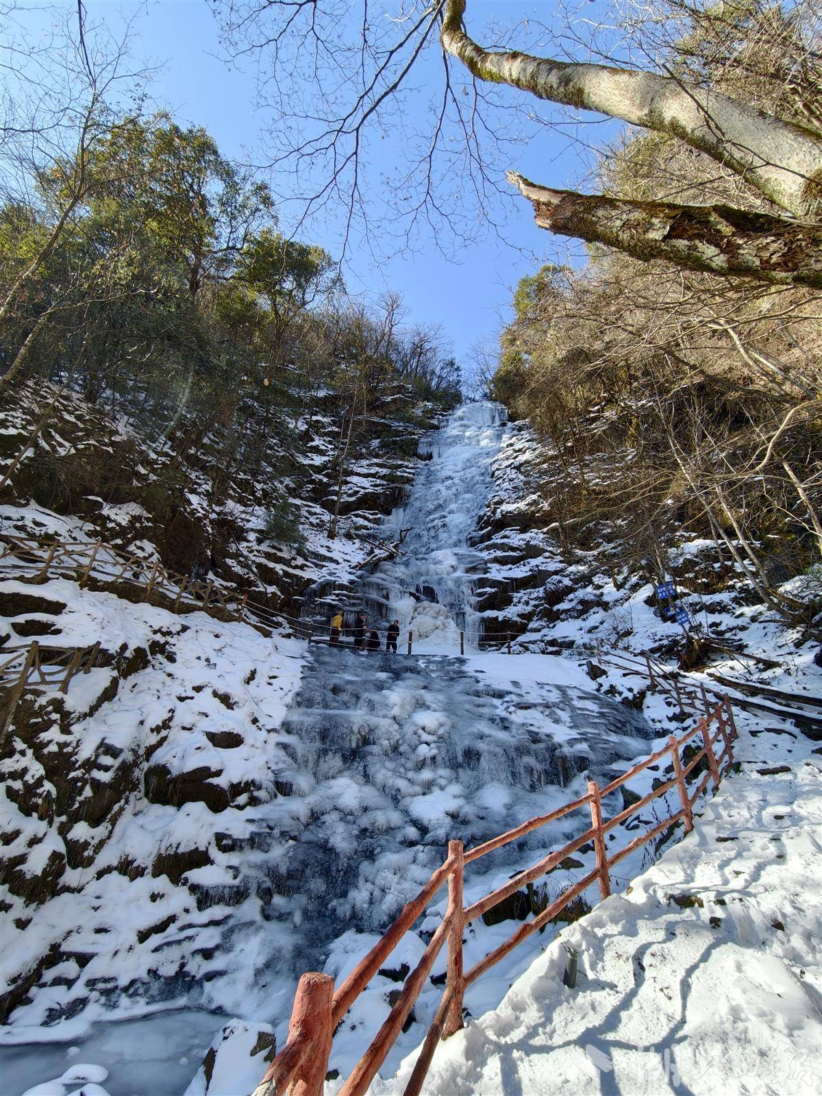 1月7日,海拔1200米的竹溪县营盘山生态旅游景区,气温零下8℃。湖北日报全媒记者穿上“冰爪”防滑鞋套,耗时约30分钟,登上了海拔1500米的冰瀑所在地。一路上,攀山步道被冰雪覆盖,山间溪流渐渐成冰。