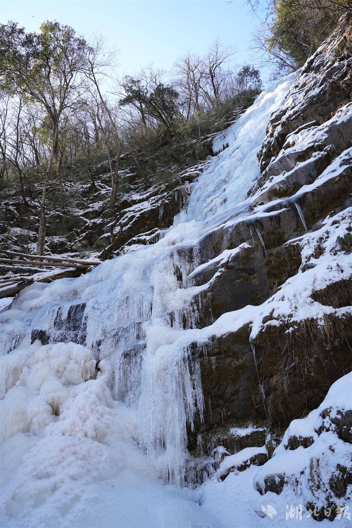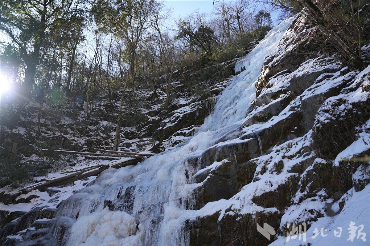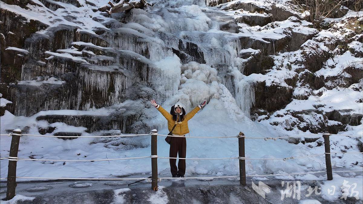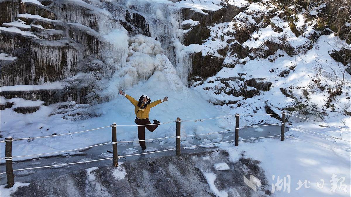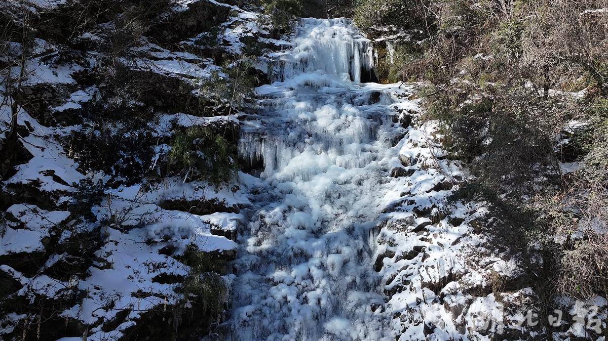 湖北日报讯(记者刘汉泽、刘天纵、通讯员郭军、王闯)飞流直下的瀑布秀出“静态美”——元旦后,十堰市竹溪县营盘山的百米瀑布被冻成“冰雕”,形成了淡蓝色的冰瀑奇观,吸引了不少鄂渝陕游客前来打卡。