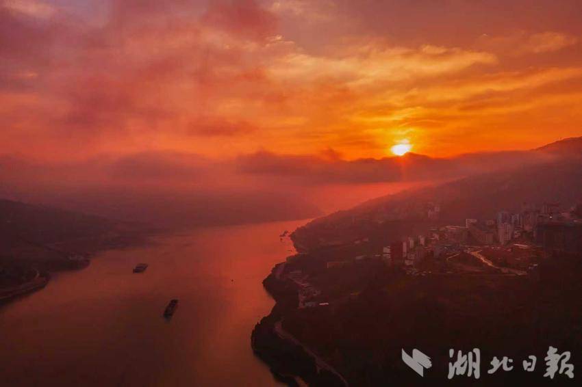霎时,瞥见东面云层透出浅金色的光晕,像有人打翻了蜜罐,将天边的云絮染成蜜糖色。激动的心情无以言表,长江三峡披上洁白的细纱,红霞如飘动的丝绸层层铺展,一艘艘游轮像花朵穿梭其间。
