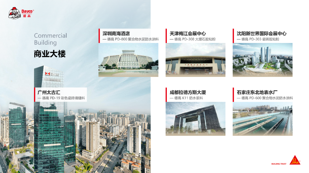 在商业建筑场景中,深圳南海酒店、天津梅江会展中心等标杆项目引入其专业建材,助力打造兼具实用性与高品质的商业空间。