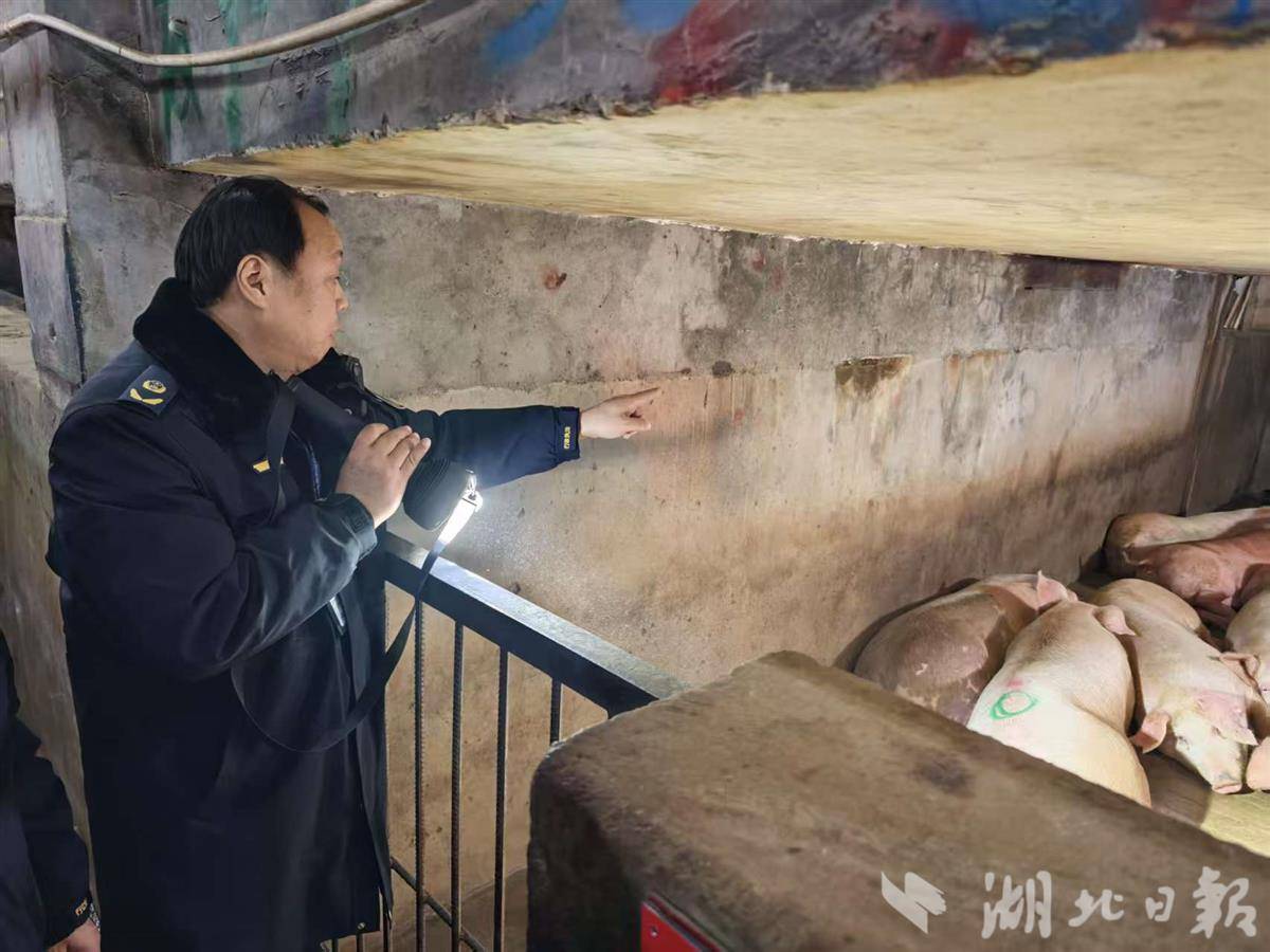 执法人员查看生猪状况。 湖北日报全媒记者杨然 摄