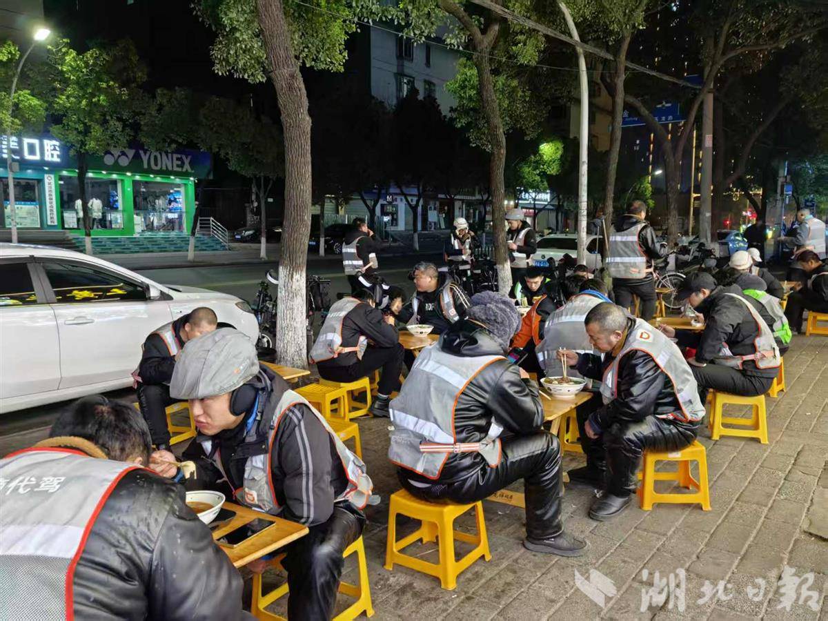 1月14日深夜11点多,汉阳玉龙路的“江城土黄牛牛肉面馆”灯火通明。一群特殊的客人陆陆续续到来,他们身穿滴滴代驾马甲,带着一身寒气。武汉恒通玮业滴滴代驾公司主管杜玉在门口招呼:“来,签个到。”