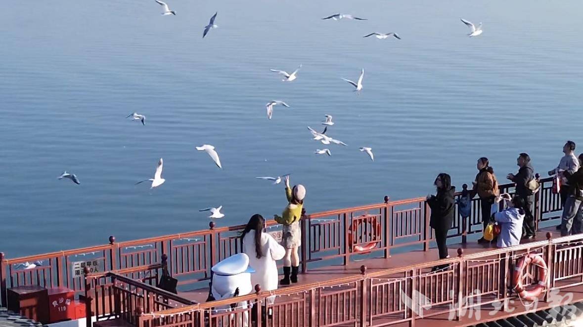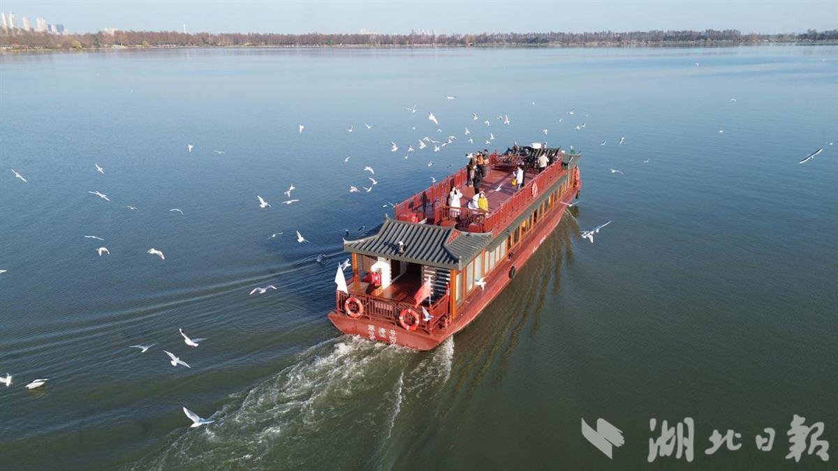 东湖游船楚风园码头至磨山码头的常规航线串联起多处鸥群聚集区,每日九点半开第一班船,末班船为四点半,周末更是加密循环发船,实现游客“随到随上”。今年,东湖游船还优化推出“观鸥专线”,营运时间为上午十点至下午四点,一天七班整点发船。从楚风园码头登船,环湖一圈45分钟不靠岸,特别开放二层全景观甲板,确保沉浸式的观赏体验。
