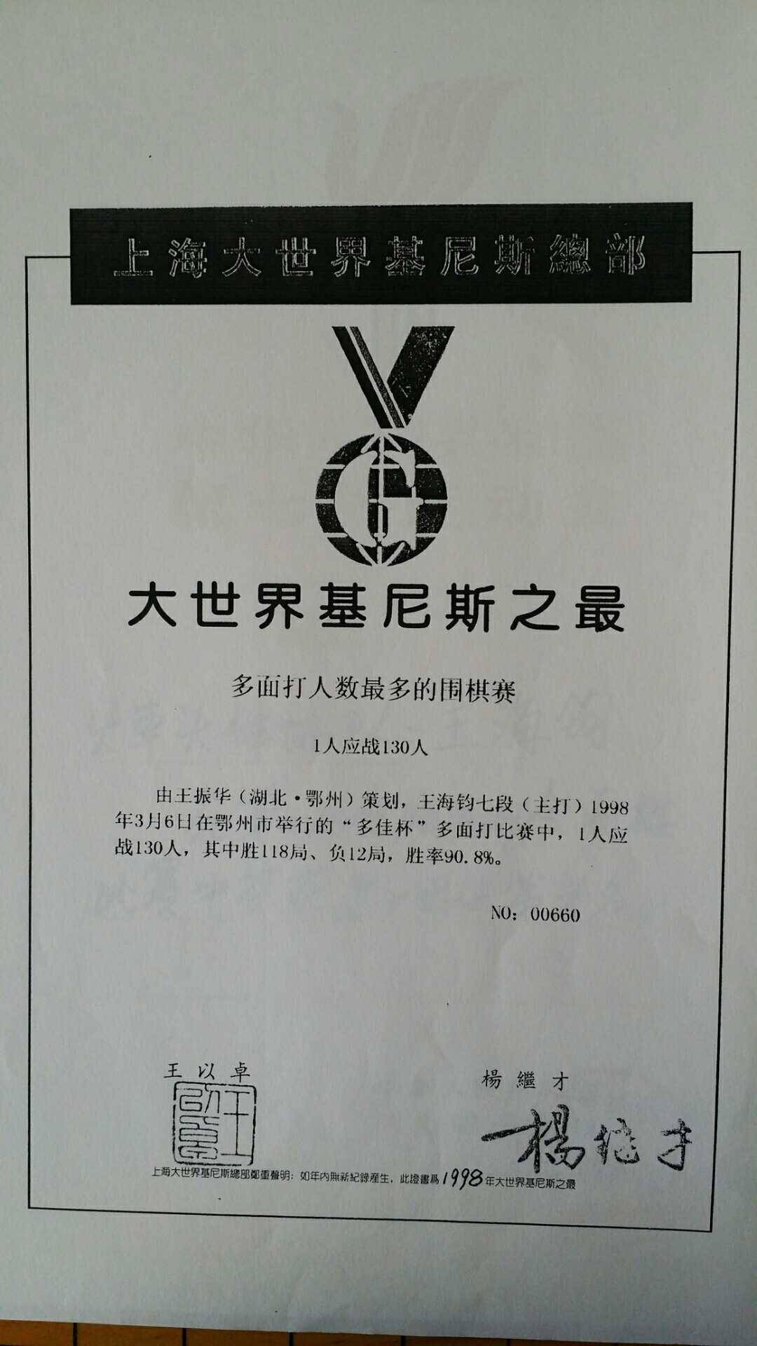 王海钧1998年3月6日在湖北鄂州创造1对130人围棋多面打吉尼斯世界纪录,棋圣聂卫平全程出席,并担任总裁判长。