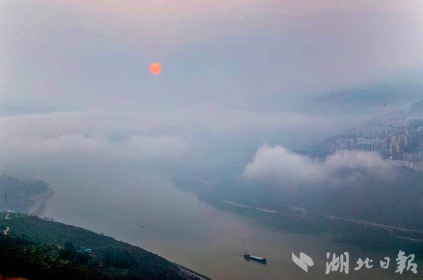 湖北日报客户端(通讯员陈功龙)1月15日清晨,长江巴东段江雾袅袅,橘红色的旭日破雾而出,悬于天际。江面烟波浩渺,一艘货轮悠然驶过,两岸山峦被薄雾轻拥,错落的巴东县城在云雾间若隐若现,恰似一幅徐徐铺展的水墨长卷。