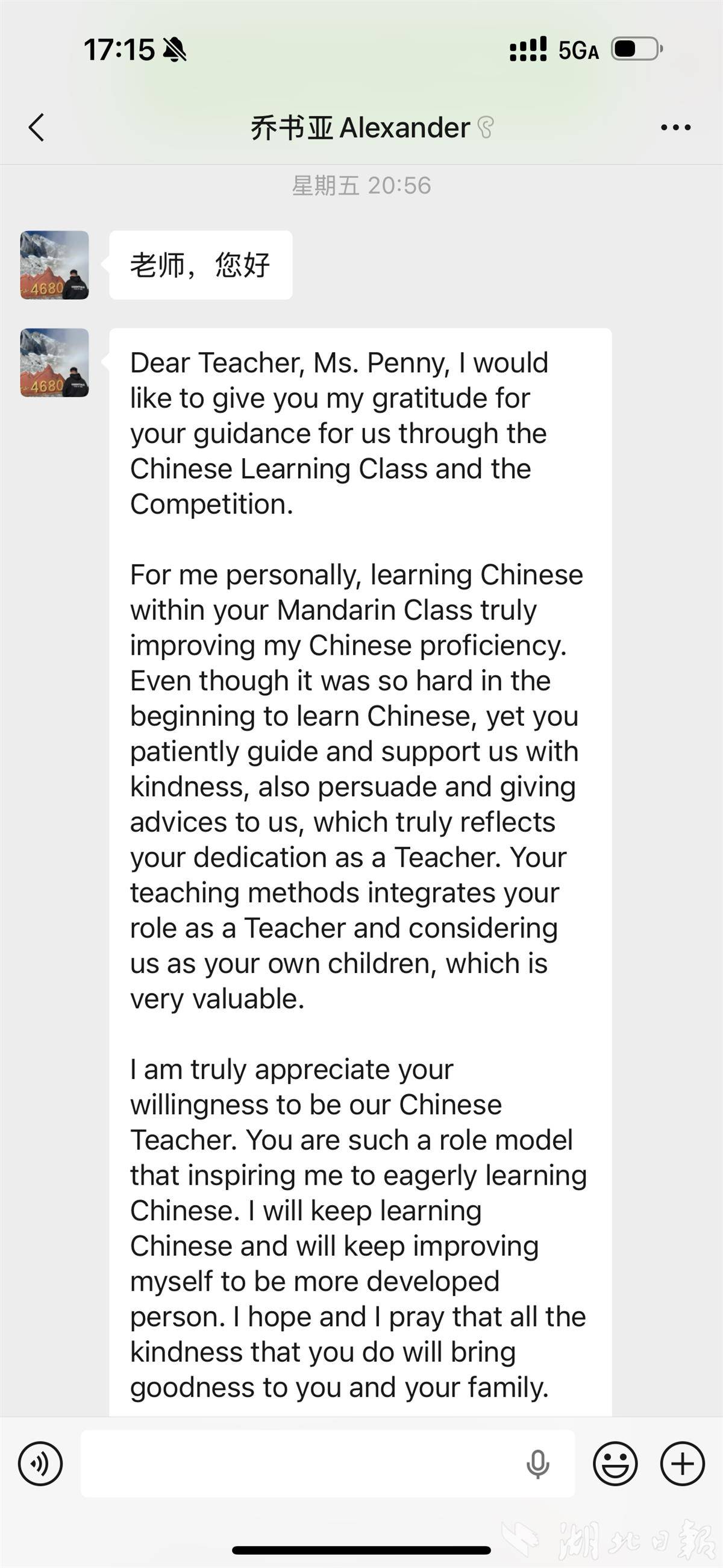 “Your teaching methods integrates your role as a Teacher and considering us as your own children, which is very valuable. (您的教学方法既体现了您作为教师的角色,又视我们如同自己的孩子一般,这种态度非常可贵。)”乔书亚在信中写道,“我由衷地感激您愿意担任我们的中文教师。您是如此一位楷模,激励着我热切地学习中文。我将继续学习中文,并不断自我提升,以成为一个更加成熟的人。”