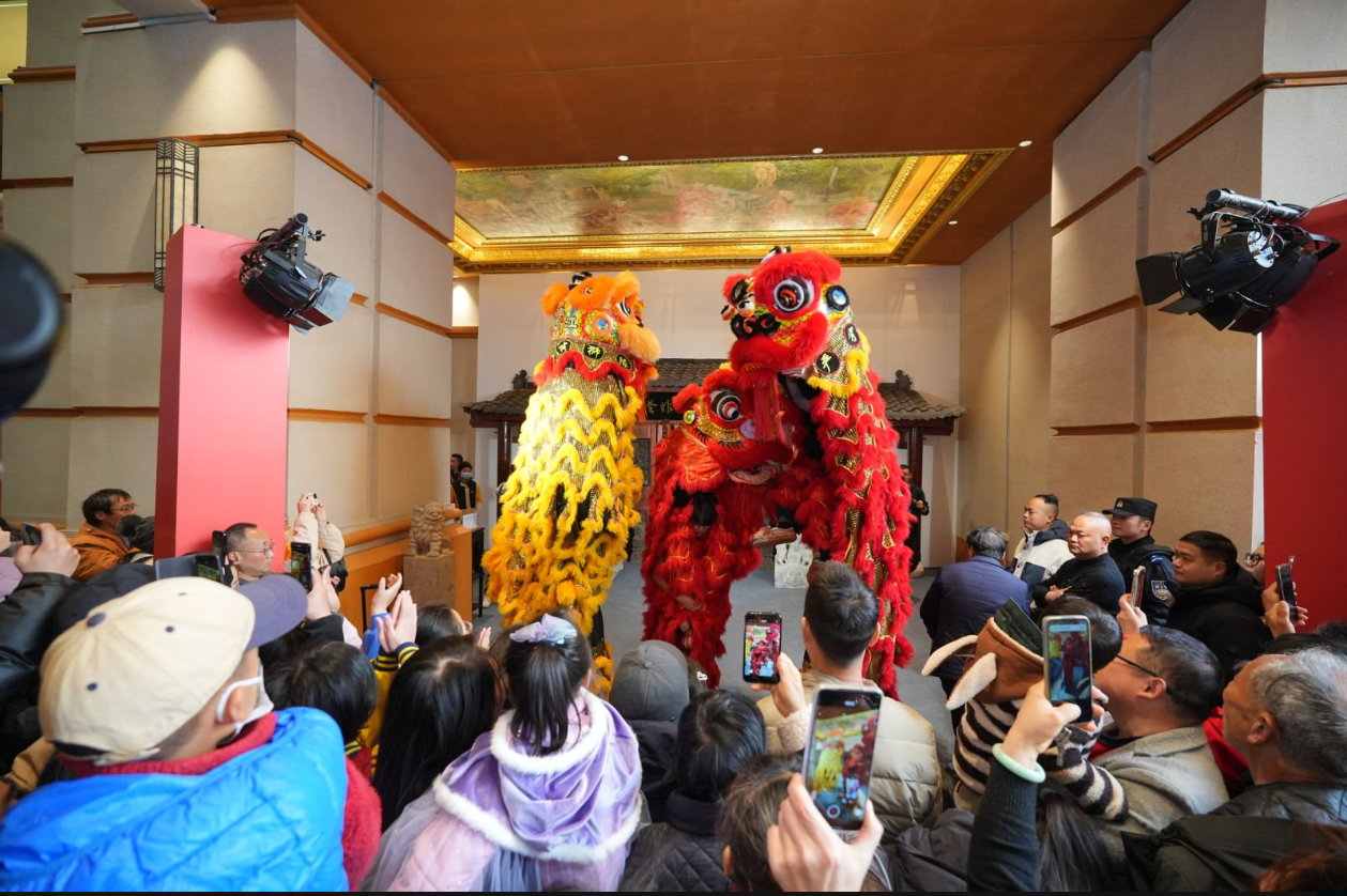 荆州分会场将非遗展演与年货市集相结合,《中国龙》鼓乐、舞狮等表演氛围热烈,现场设置打糍粑等互动体验及特色年货摊位,让市民看非遗、购年货。