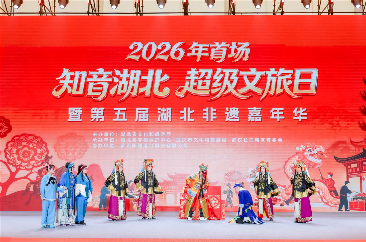 1月17日,2026年首场“知音湖北 超级文旅日”暨第五届湖北非遗嘉年华在武汉长江新区华中贸易服务区拉开帷幕。作为“知音湖北”省级文旅战略品牌下的创新IP,本次活动以非遗为主题,集展示、交流、体验、消费于一体,立体呈现荆楚文化魅力,推动荆楚文化出海。