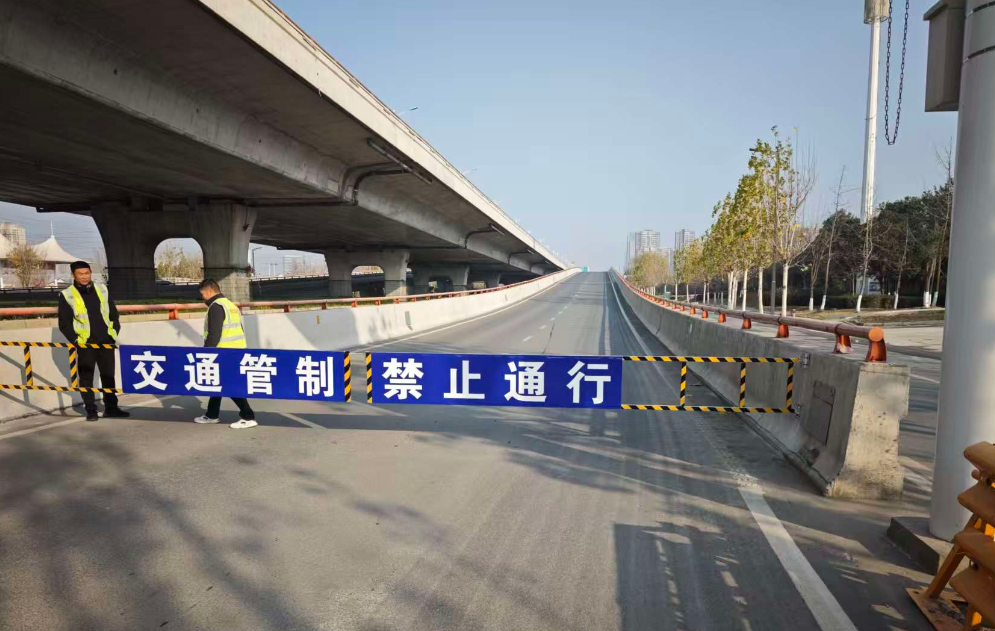 ▲襄阳交警在城市快速路各路段上下匝道安装物理闸栏,将融雪剂等物质先期投放到匝道出入口位置。