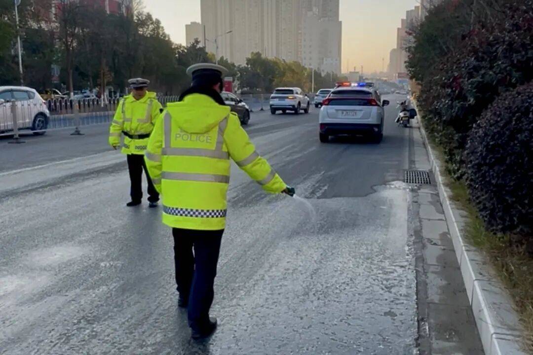 ▲襄阳交警在易结冰路段加强巡逻管控。