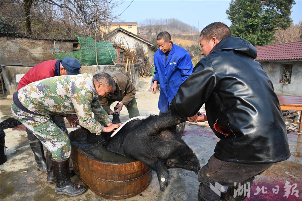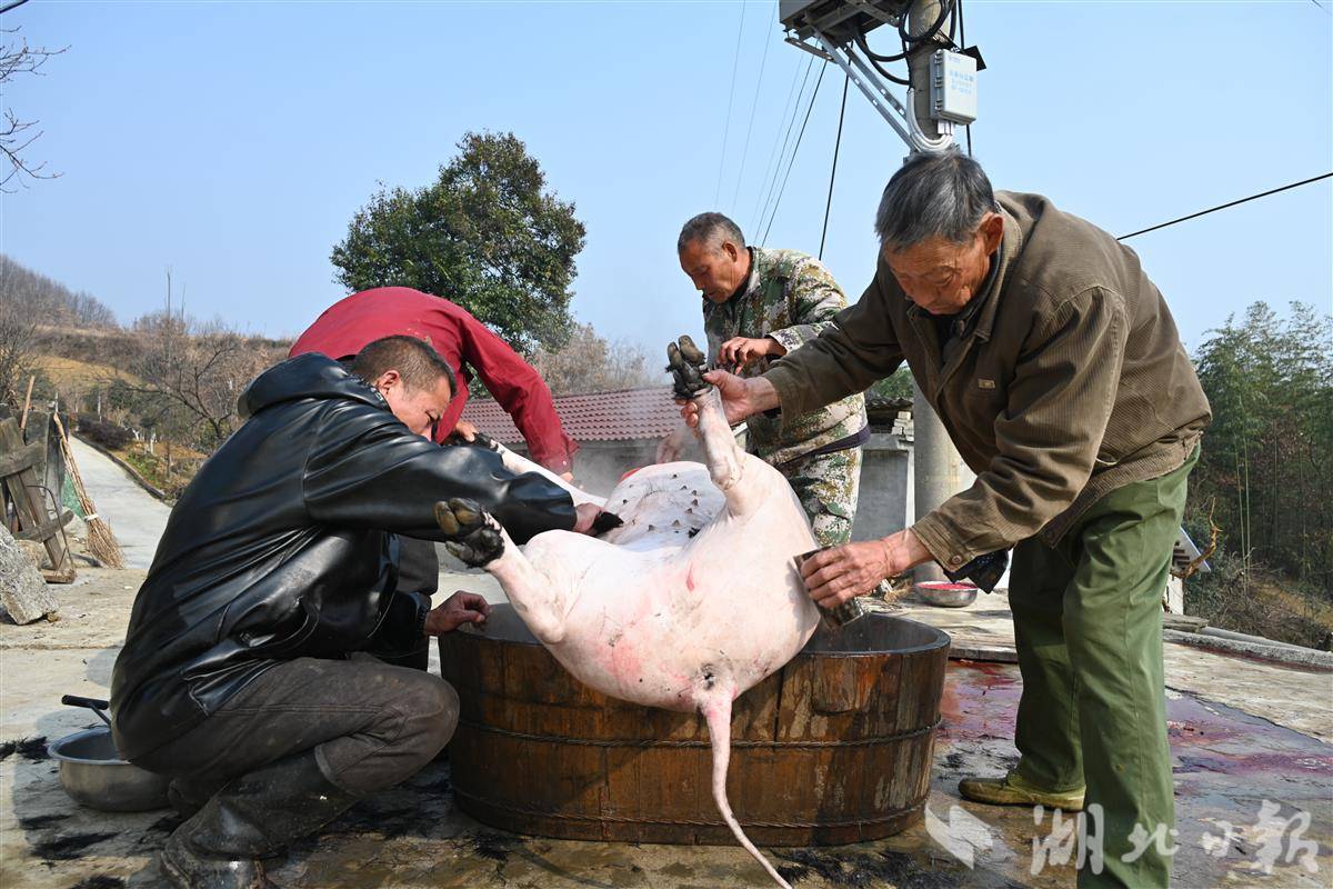 湖北日报讯(通讯员王涛)2026年1月17日,在湖北省十堰市郧阳区杨溪铺镇云彩山村,人们在杀年猪,喝刨猪汤,备年货。杀年猪喝刨猪汤是当地的传统习俗。每到寒冬腊月的季节,人们相互邀约,帮忙杀年猪,喝刨猪汤,购买猪肉准备过年,一时间人欢马叫,好不热闹。