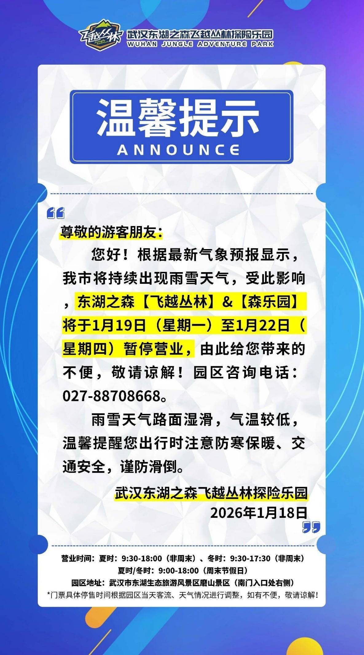 受未来几天恶劣天气影响,为保障游客安全,磨山索道自2026年1月19日-2026年1月22日期间临时停运,恢复时间将根据天气及设备检测情况另行通知。
