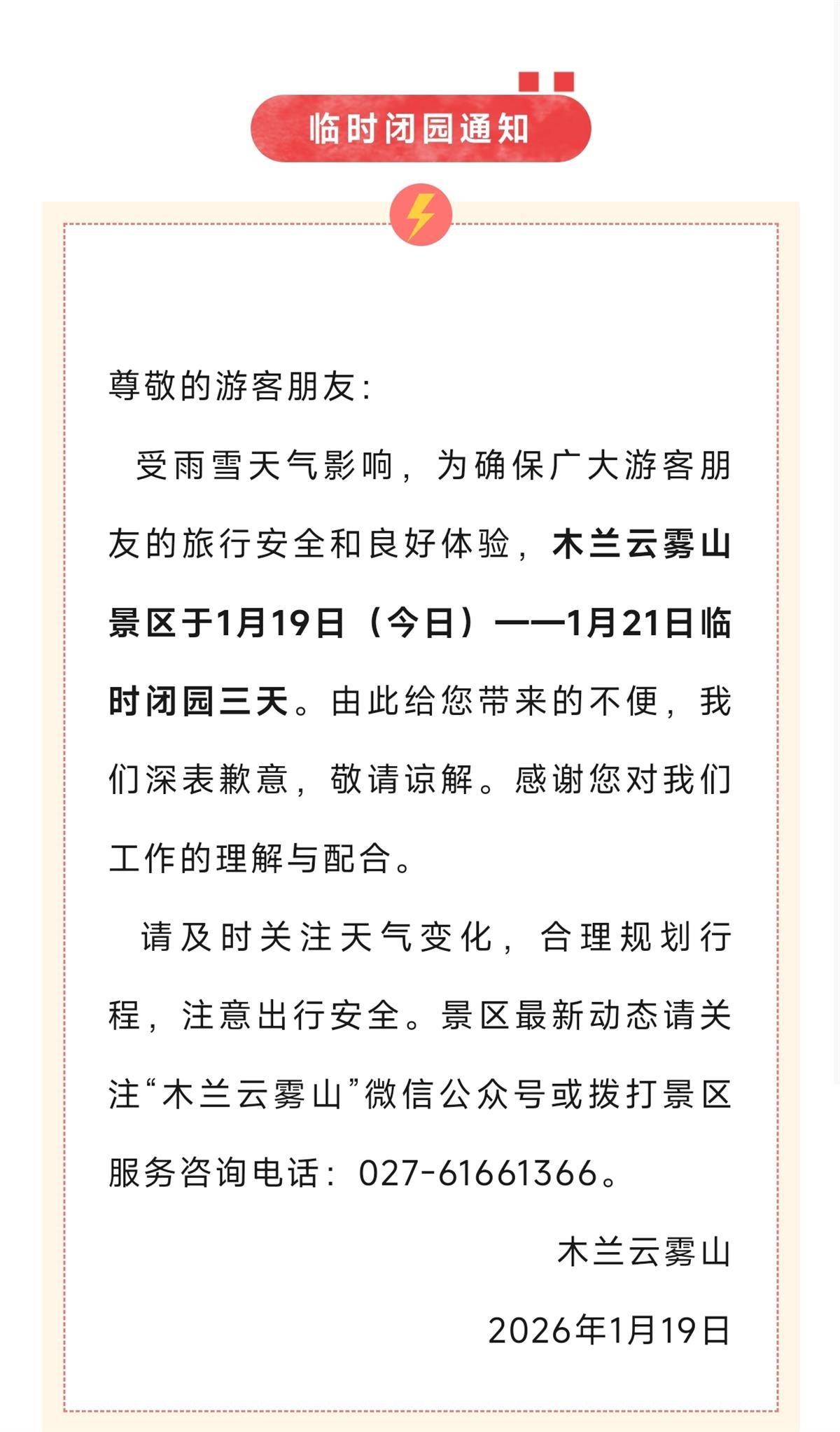 受雨雪天气影响,为确保广大游客朋友的旅行安全和良好体验,木兰云雾山景区于1月19日至1月21日临时闭园三天。由此给您带来的不便,我们深表歉意,敬请谅解。感谢您对我们工作的理解与配合。