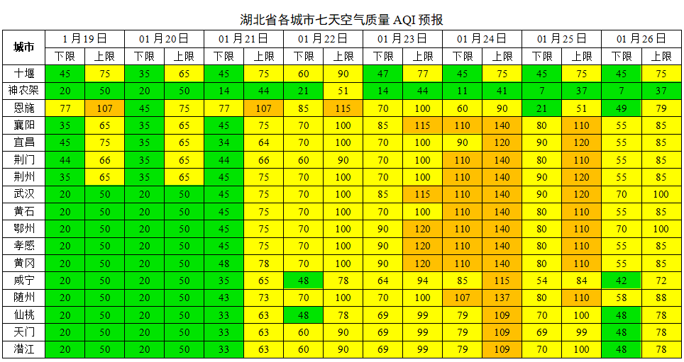 湖北日报讯(记者刘郸、通讯员李斌、实习生周子川)1月19日,湖北省生态环境厅发布最新空气质量预测:本周前半段(1月19-22日),全省空气质量总体优良。1月23日之后大气扩散条件一般或较差,需关注24日夜间开始的上游污染物传输影响。