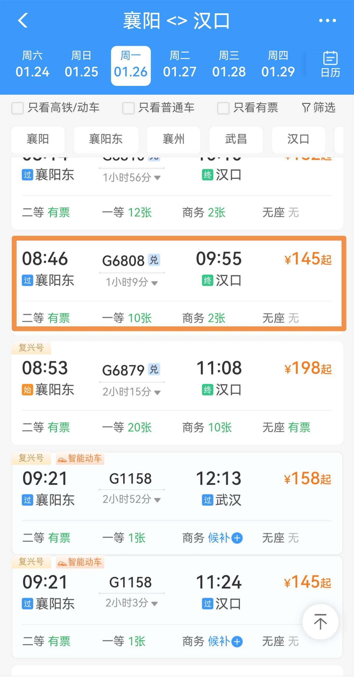 12306界面显示,1月26日当天有G6808次、G6818次、G6828次、G6838次、G6848次等五趟车在襄阳东至汉口站区间运行时间为69分钟。