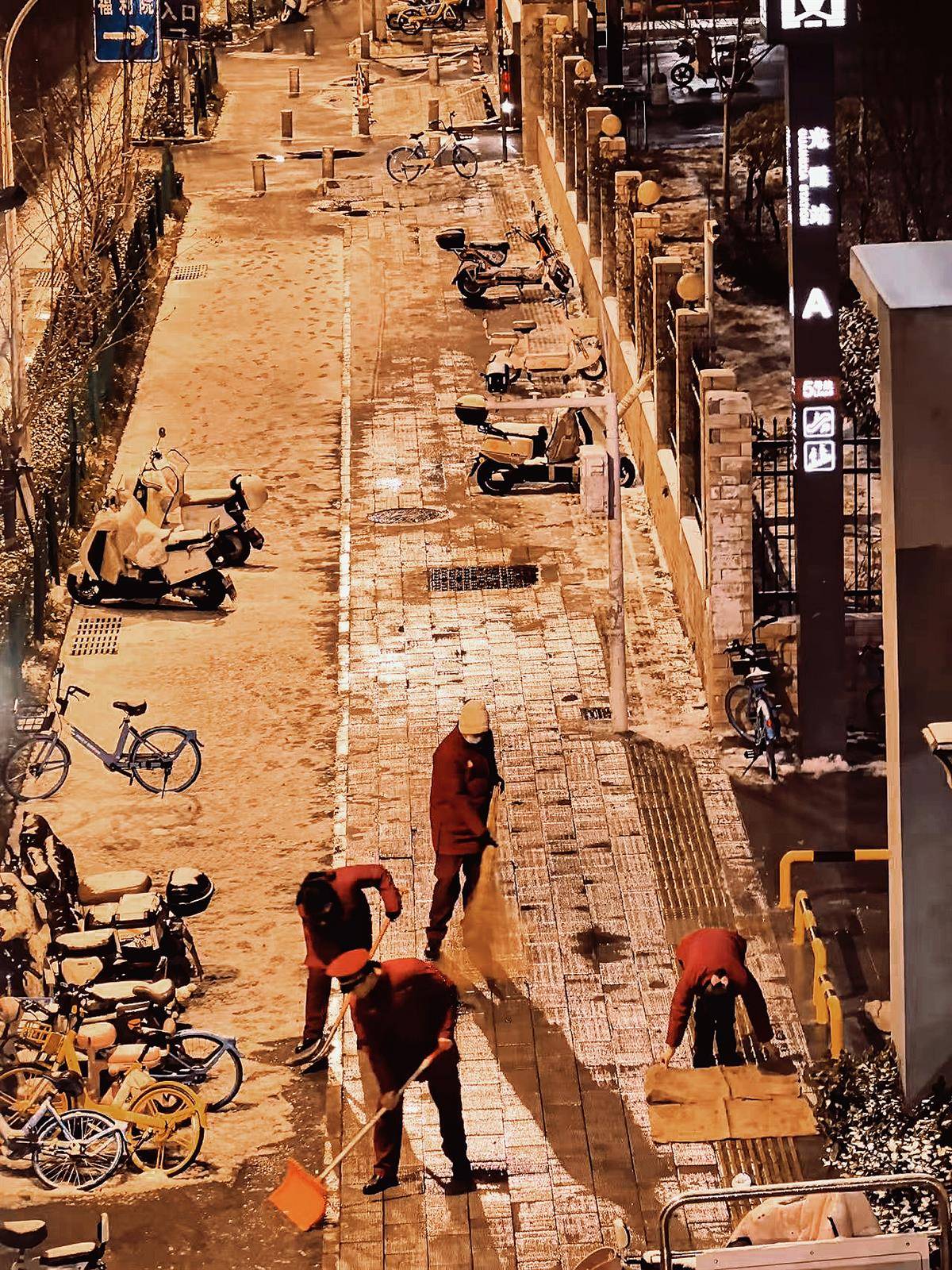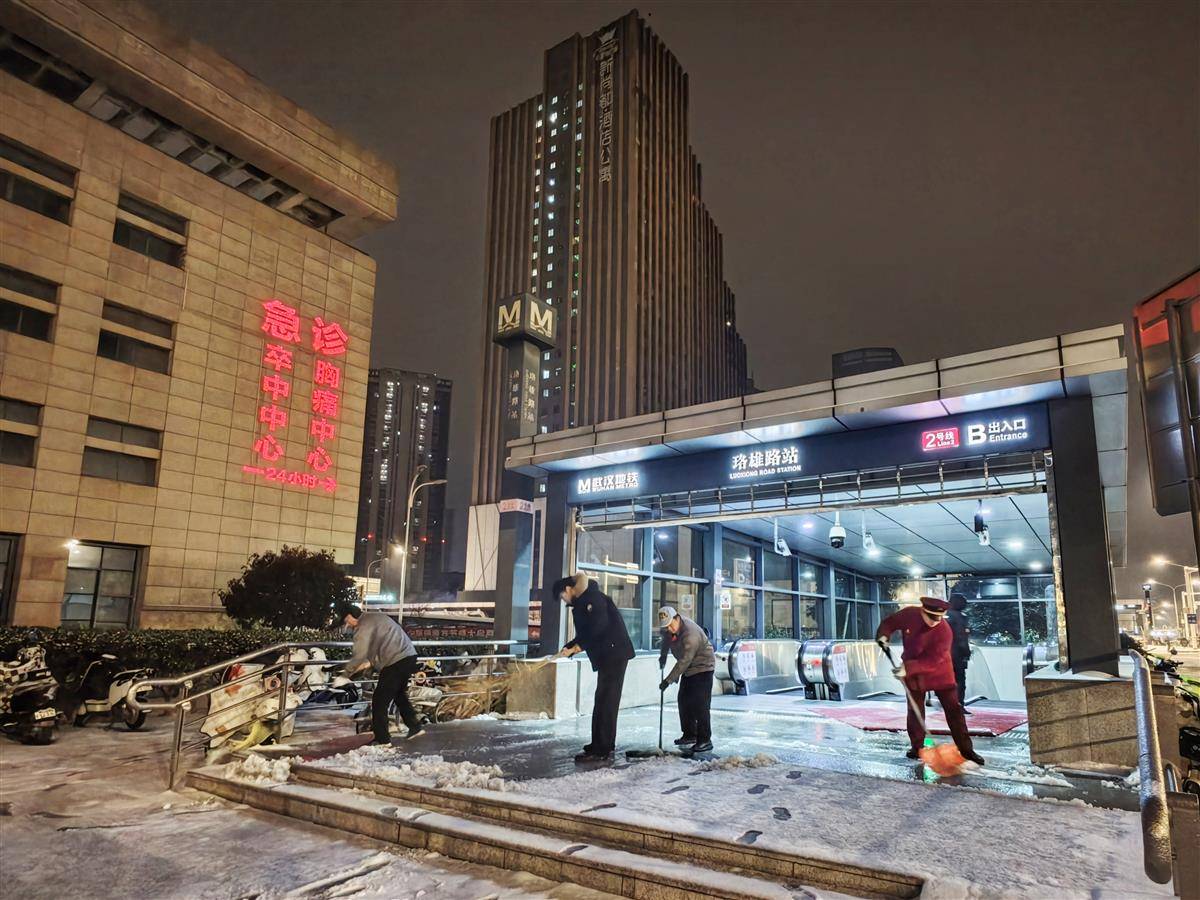 随后,一列列地铁车辆如银龙苏醒,次第驶向正线。6时整,随着晨光渐起,2号线列车按时投入新一天的运营。当天凌晨,调度中心全过程掌握线网各区域降雪情况,统一调度所有线路提前整备当日运营工作,确保线网6时准时开班运营。凌晨4时起,4000余名员工清扫线网312座车站所有出入口积雪,6时开班前铺设好防滑地垫、麻袋。