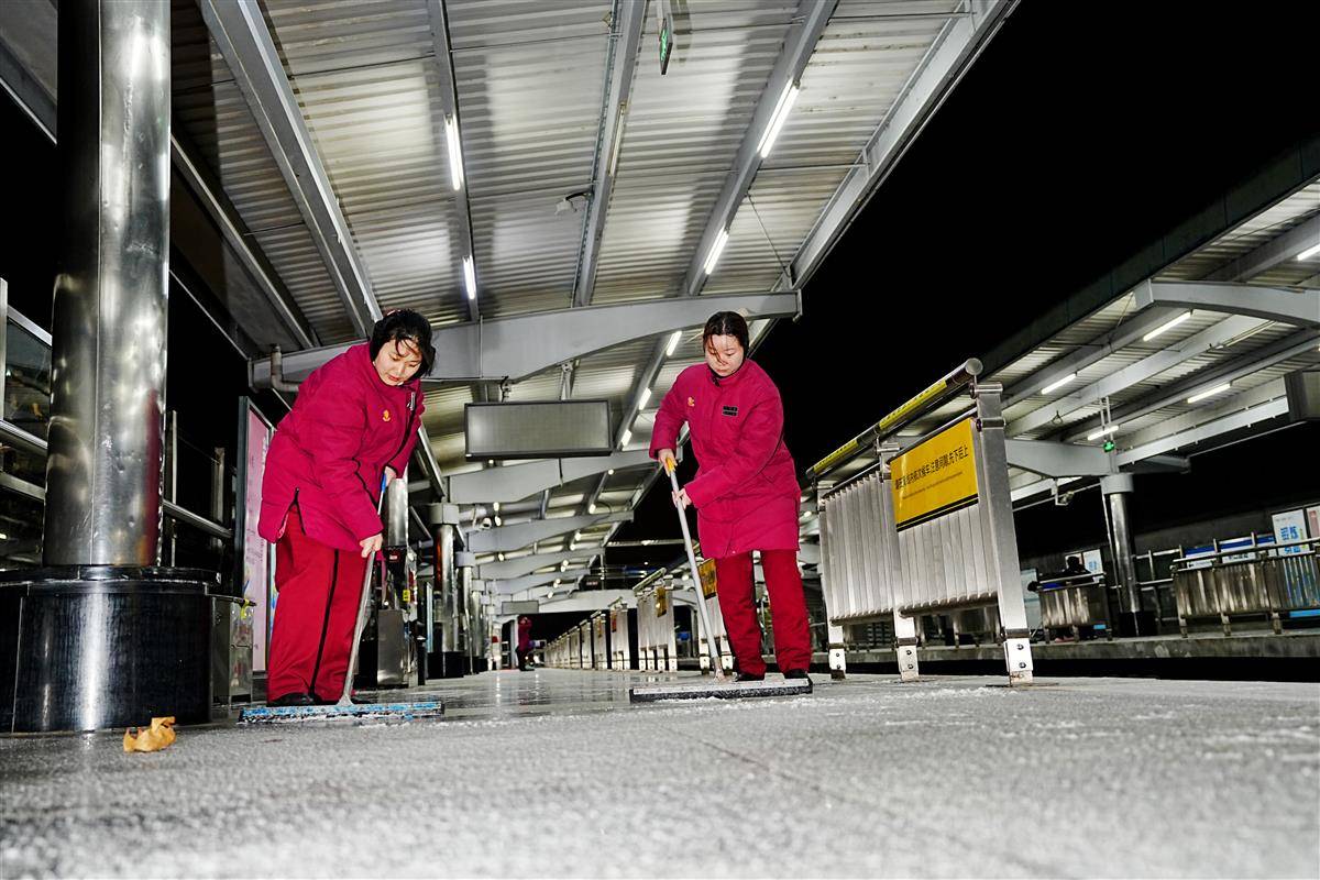 20日凌晨4时,地铁1号线硚口站工作人员清扫站台积雪 产启斗 摄